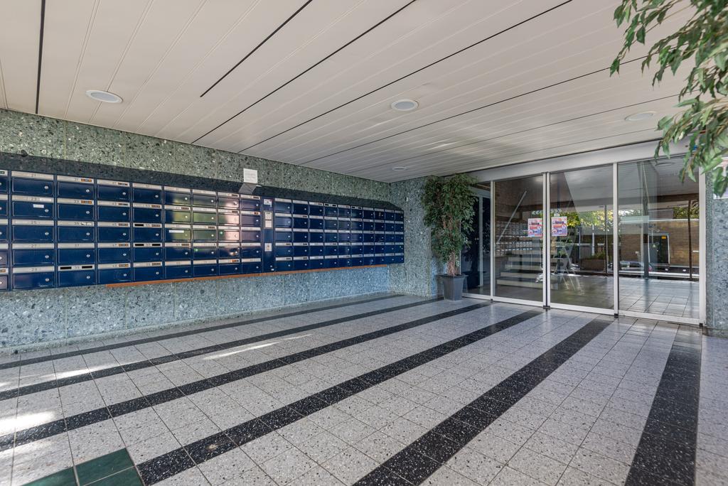 * Gesloten portiek met postbussen en bellentableau; ontvangsthal met trappenhuis en toegang tot de liften.