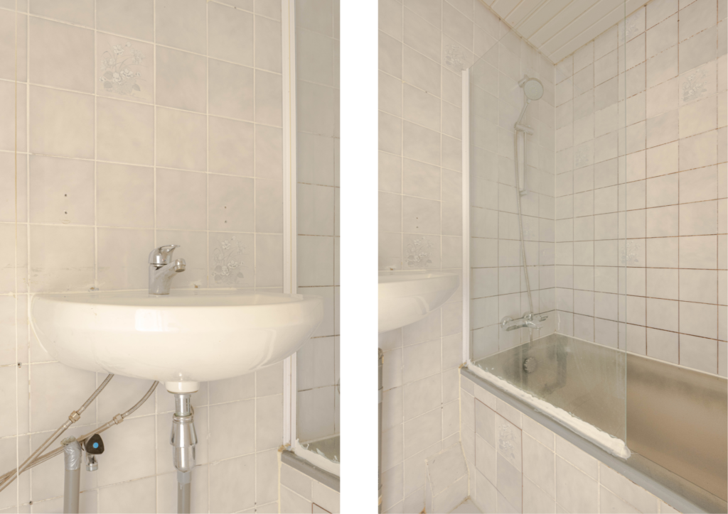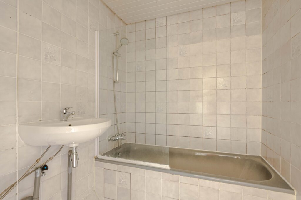 * Te moderniseren badkamer, geheel betegeld, voorzien van mechanische ventilatie, ligbad met de douche en wastafel.