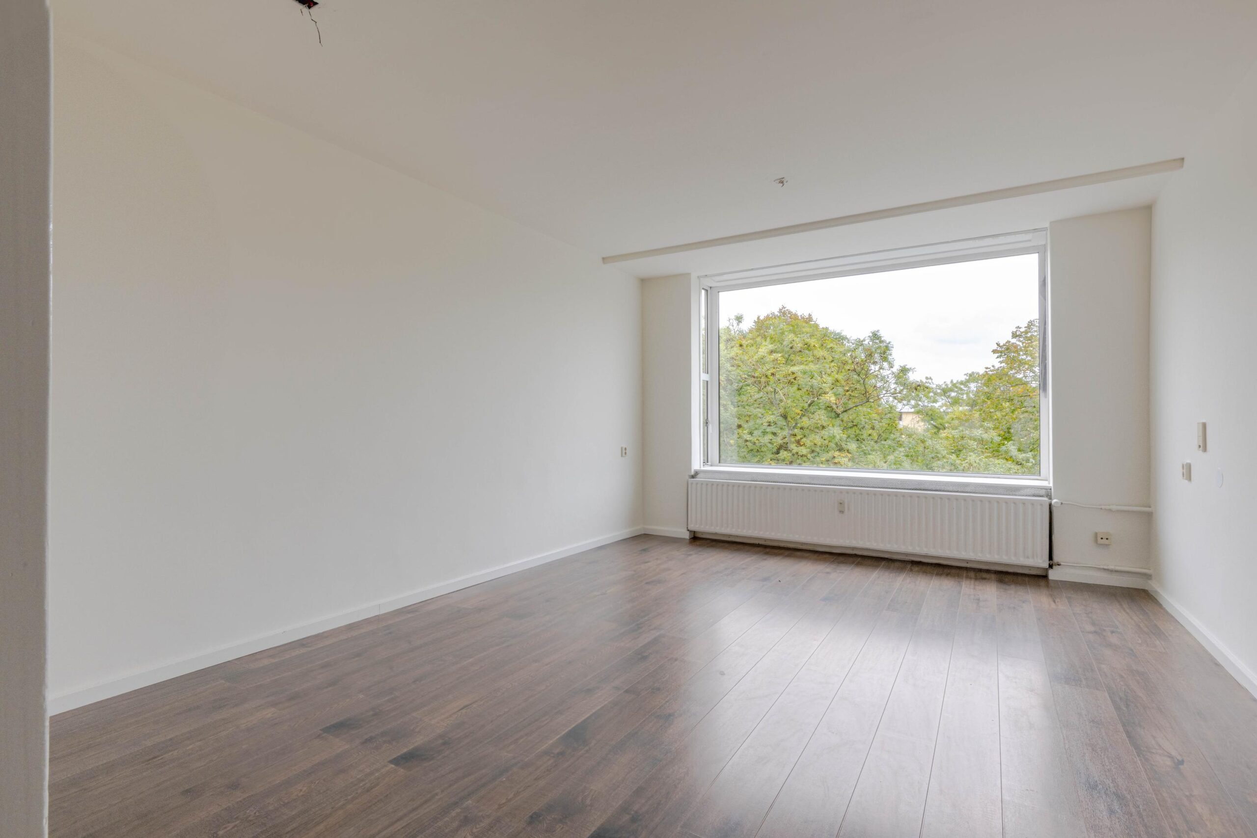 * Riante, lichte woonkamer voorzien van laminaatvloer, gestuukte wand- en plafondafwerking, erker aan de straatzijde.