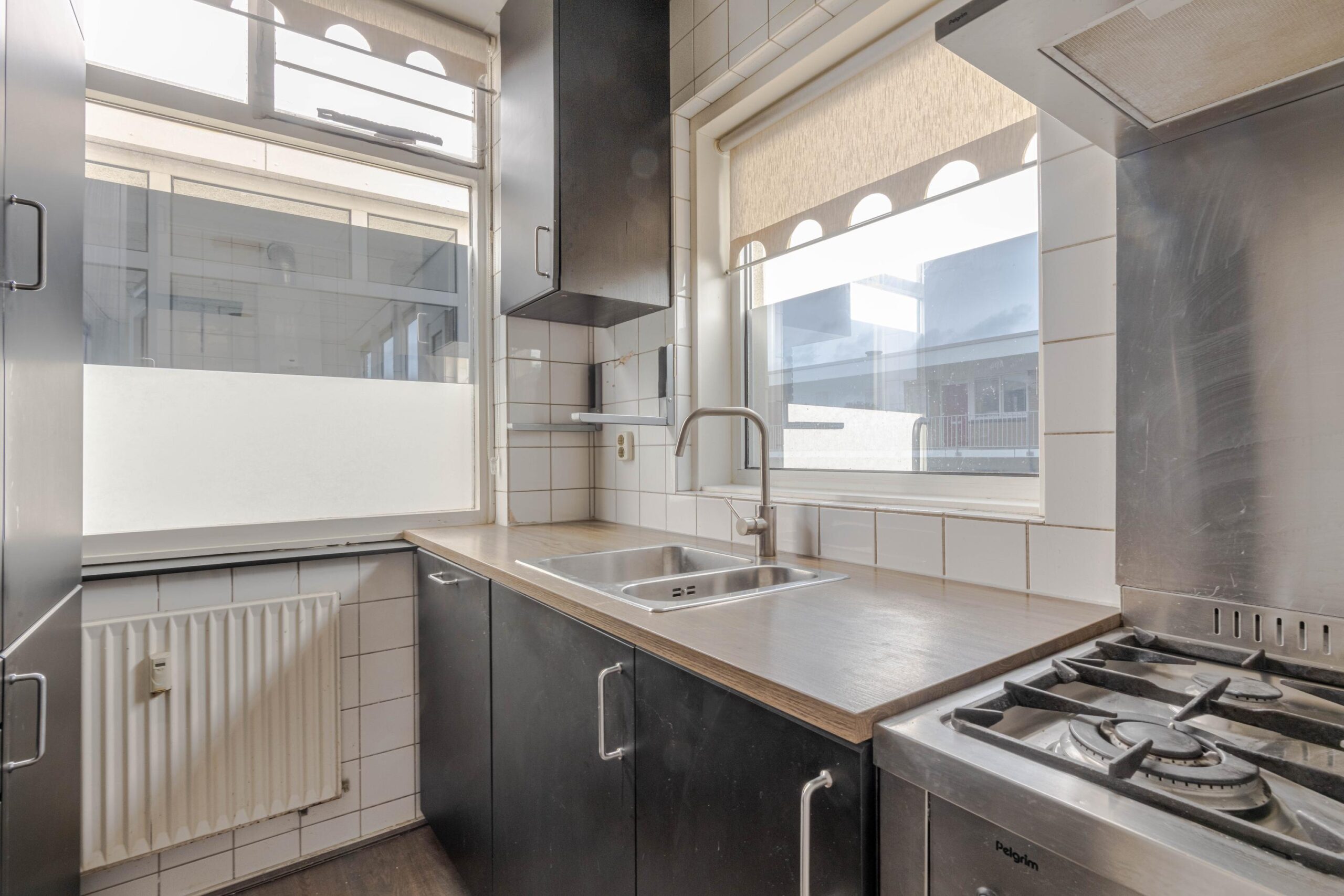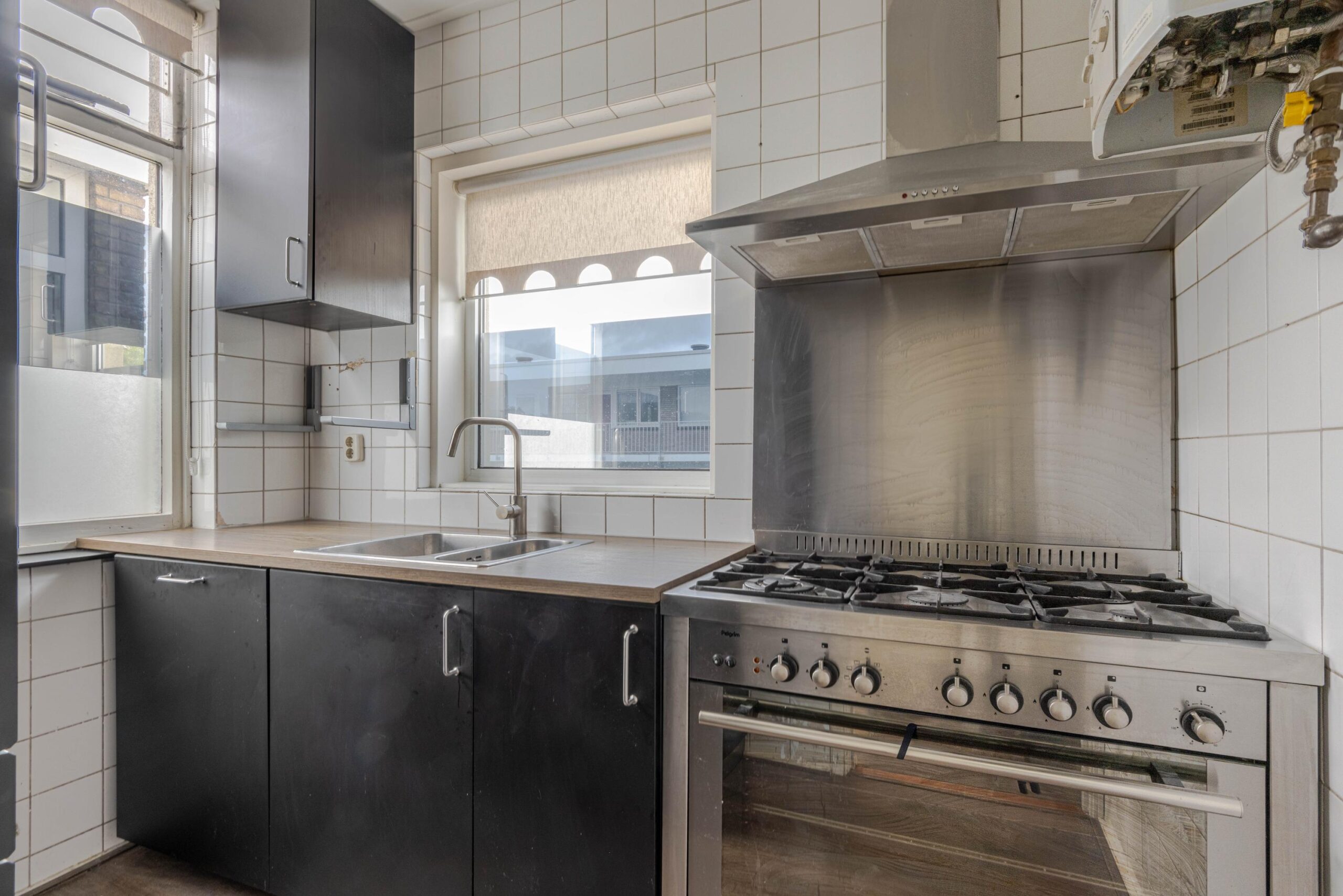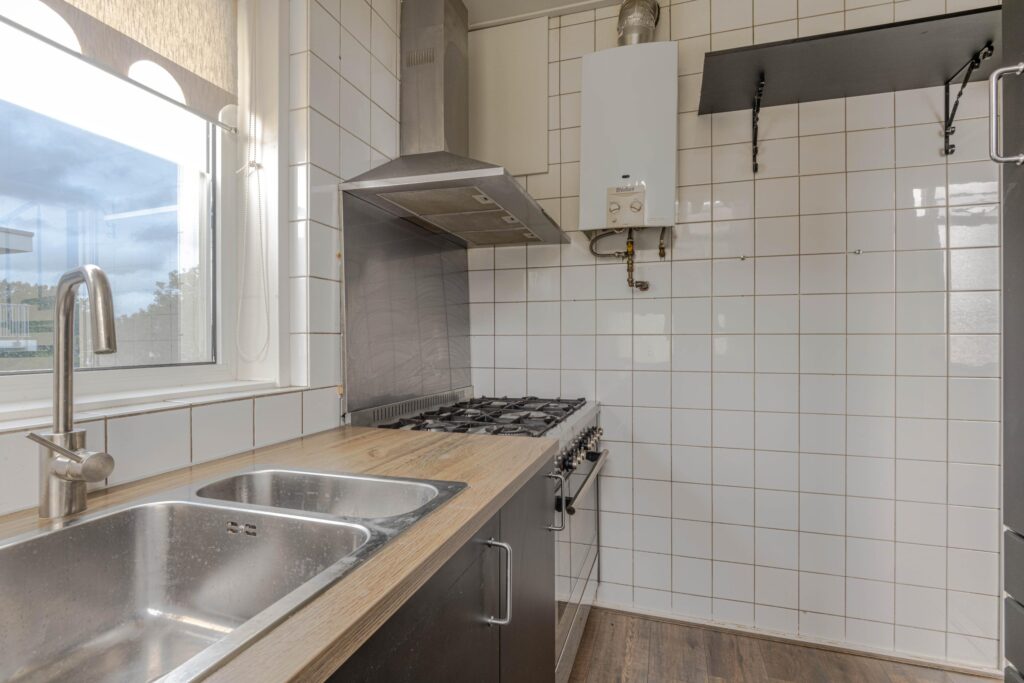 * Keuken voorzien van laminaatvloer, betegelde achterwand, nette donkere inbouwkeuken met apparatuur: gaskookplaat, afzuigkap, oven, koel-vriescombinatie, vaatwasmachine en opstelling van de geiser.