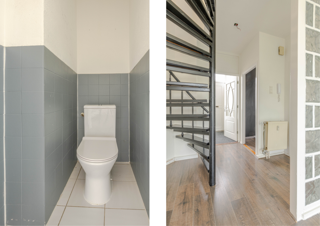 * Toiletruimte voorzien van grijze betegeling en duoblokopstelling.