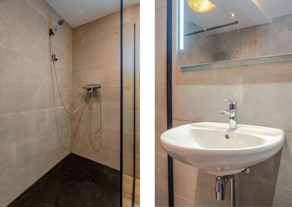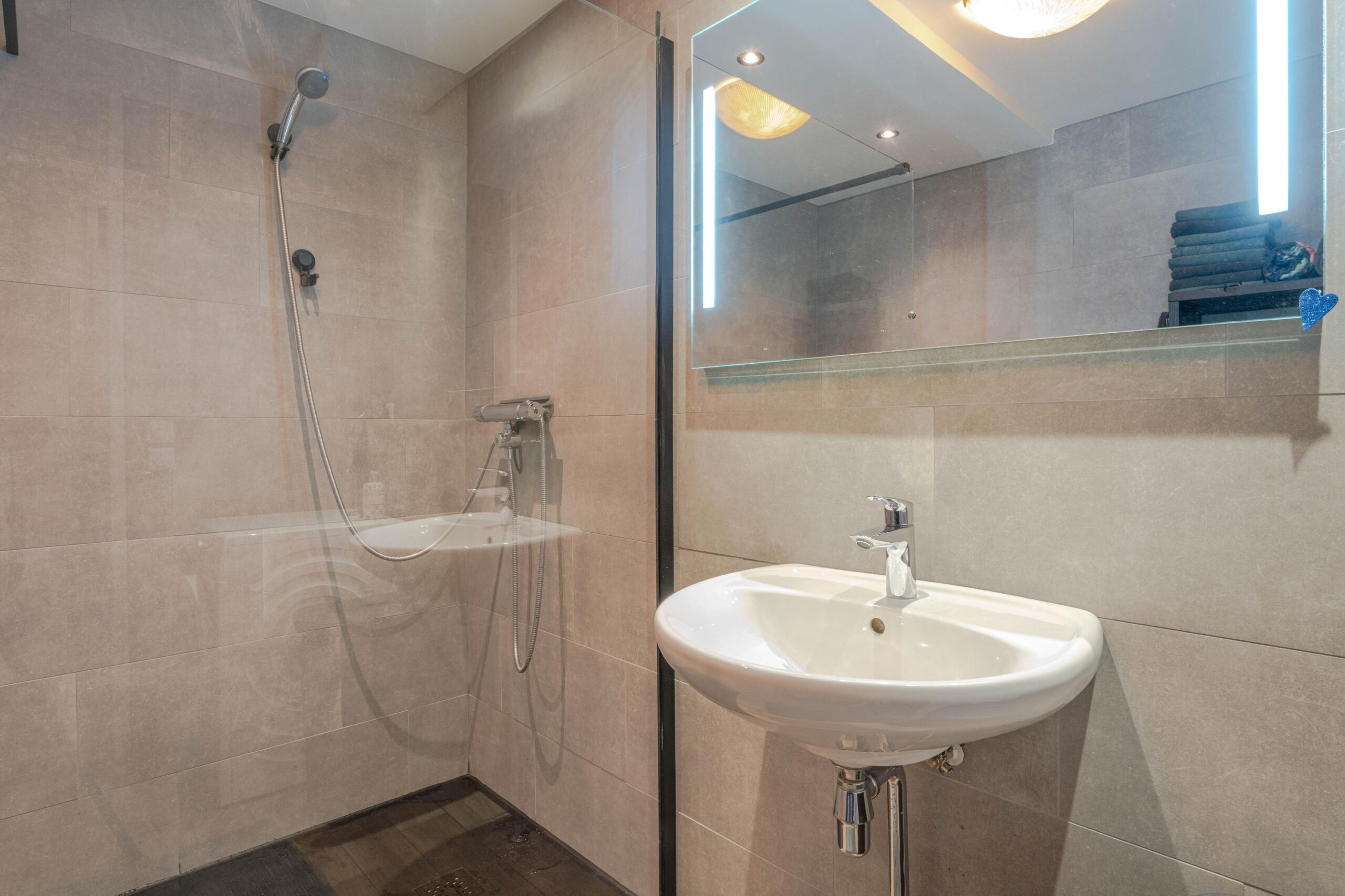 * Moderne badkamer met inloopdouche, wastafel, wasmachine-aansluiting, betegeling en verlaagd plafond met inbouwspots.