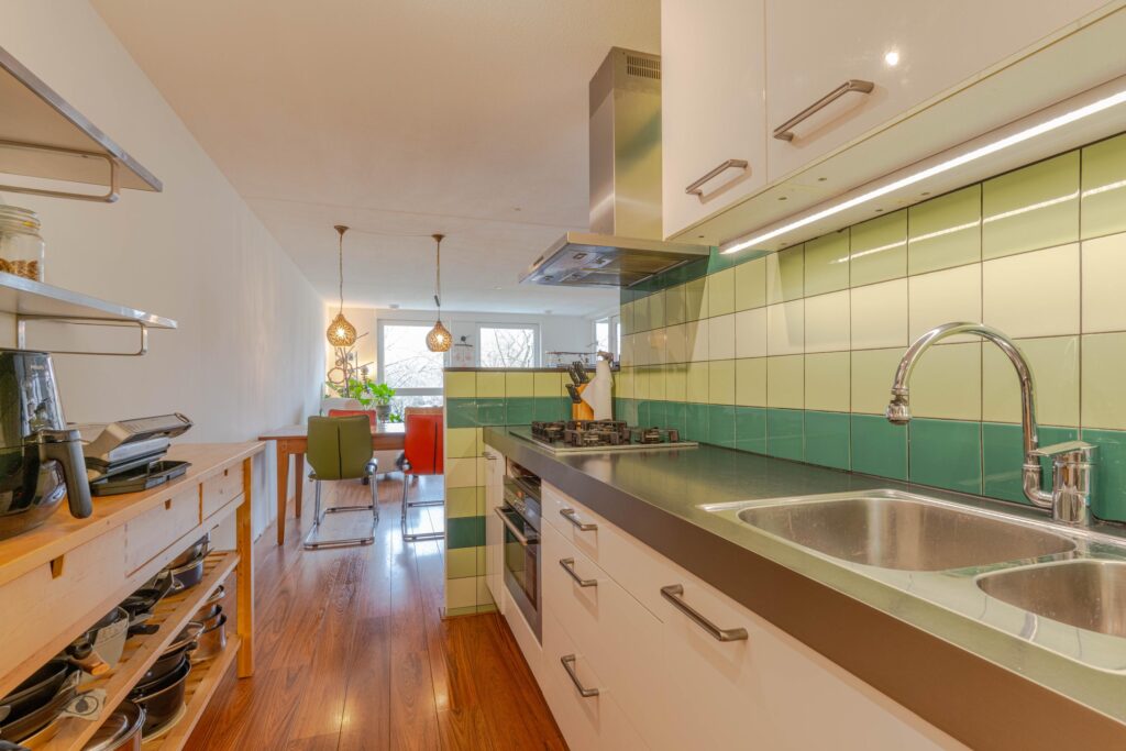 * Keuken voorzien van inbouwkeuken met diverse apparatuur: 5-pits gaskookplaat, combimagnetron, schouw afzuigkap en vaatwasmachine.