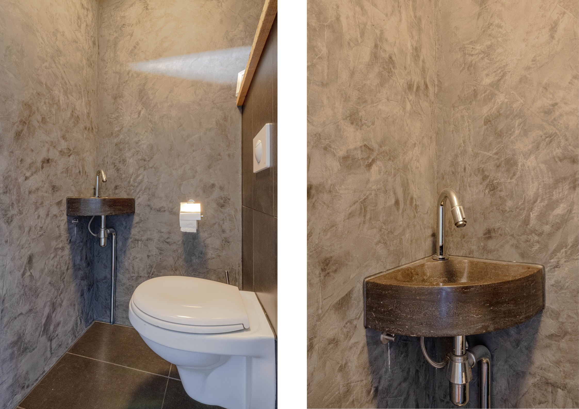 * Toiletruimte met wandtoilet, hoekfonteintje en moderne wandafwerking.