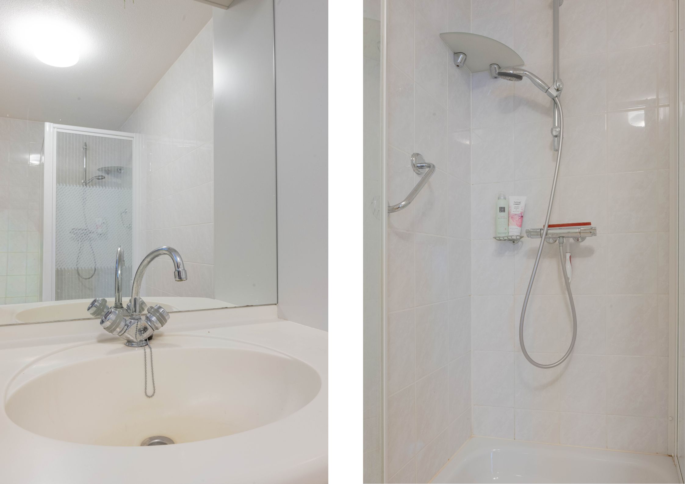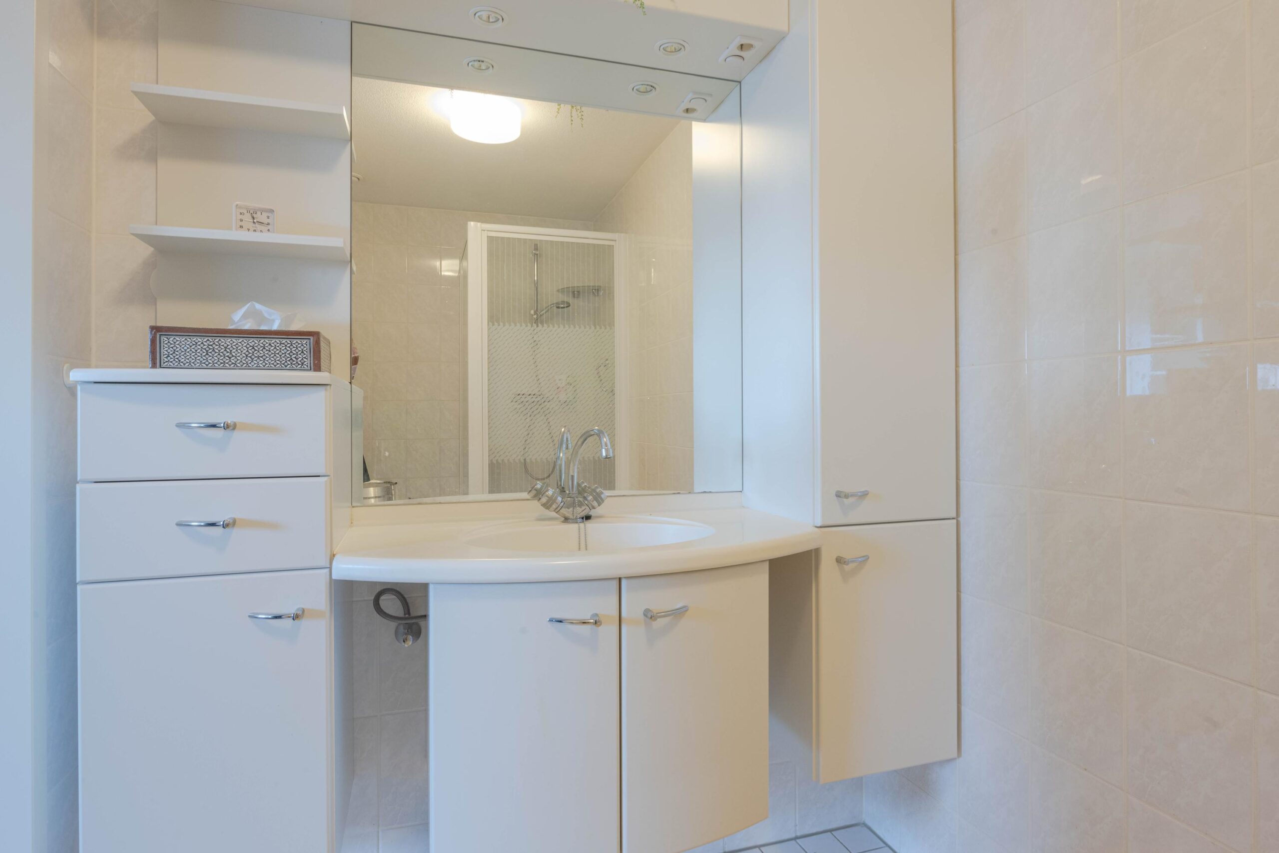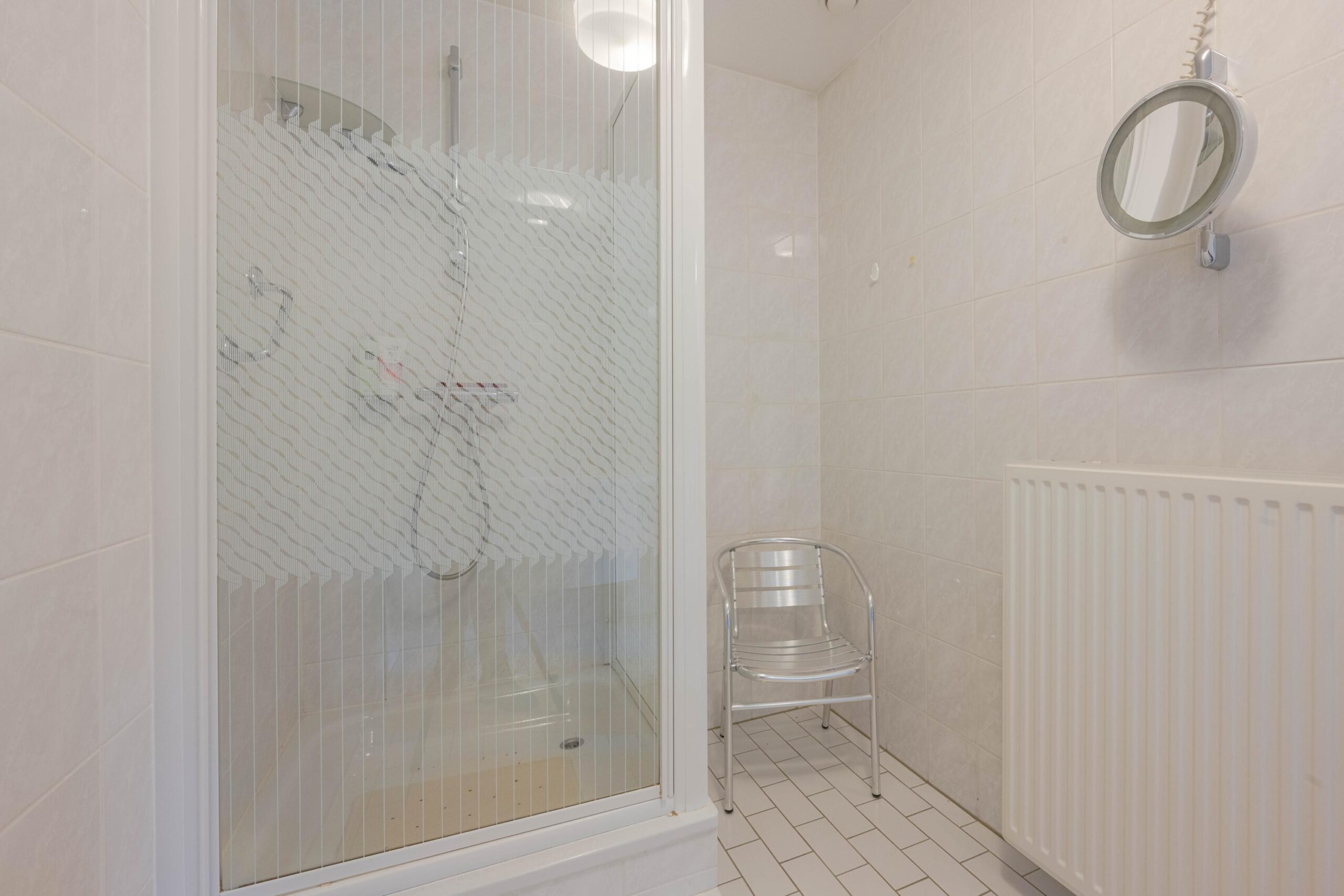 * Badkamer voorzien van lichte betegeling, douchecabine, wastafelmeubel en radiator.