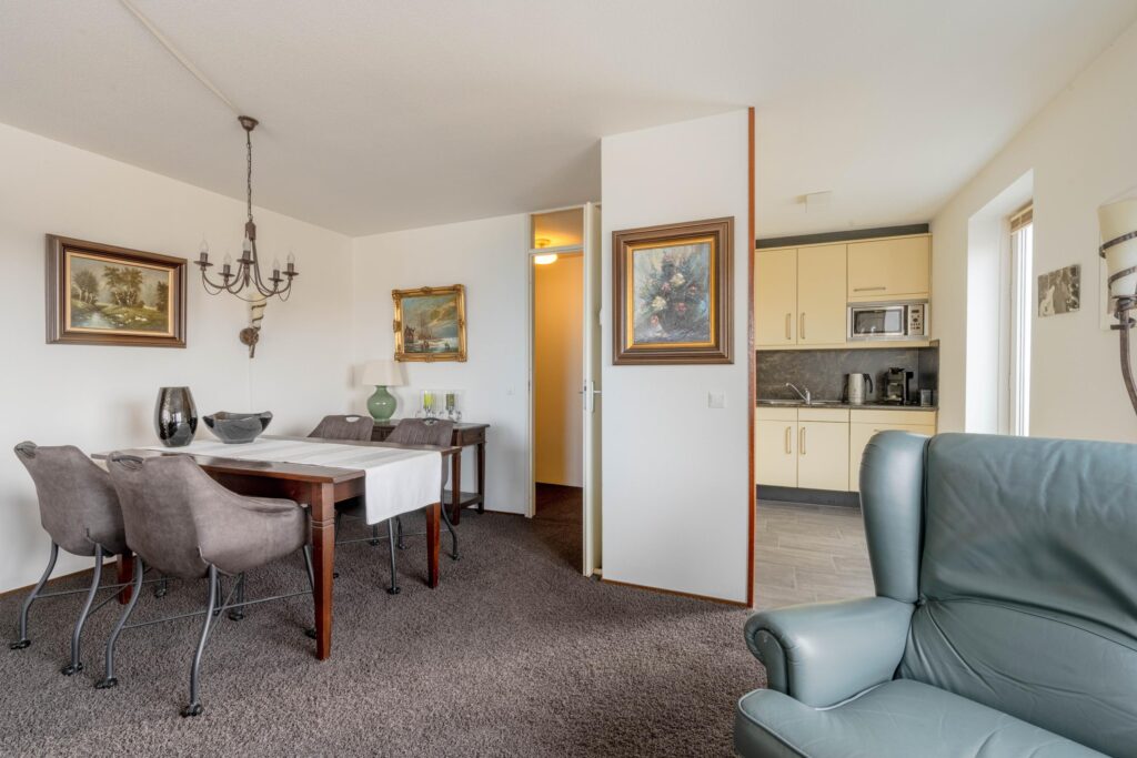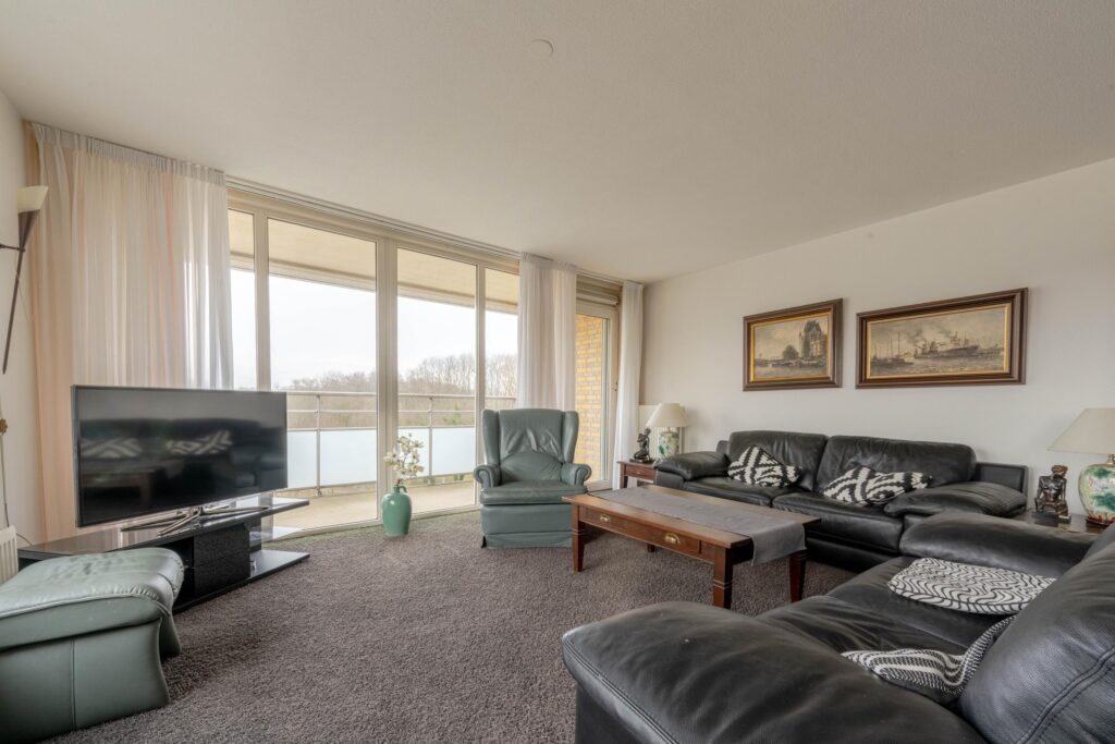* Lichte woonkamer voorzien van tapijtvloer met deur naar het balkon en toegang tot de open keuken.