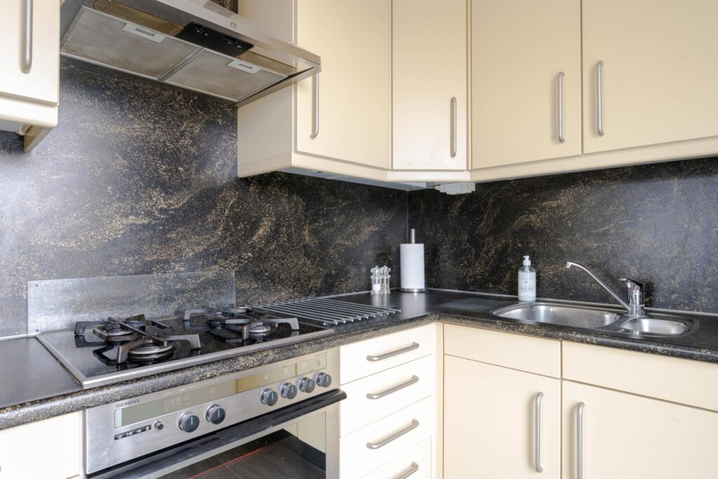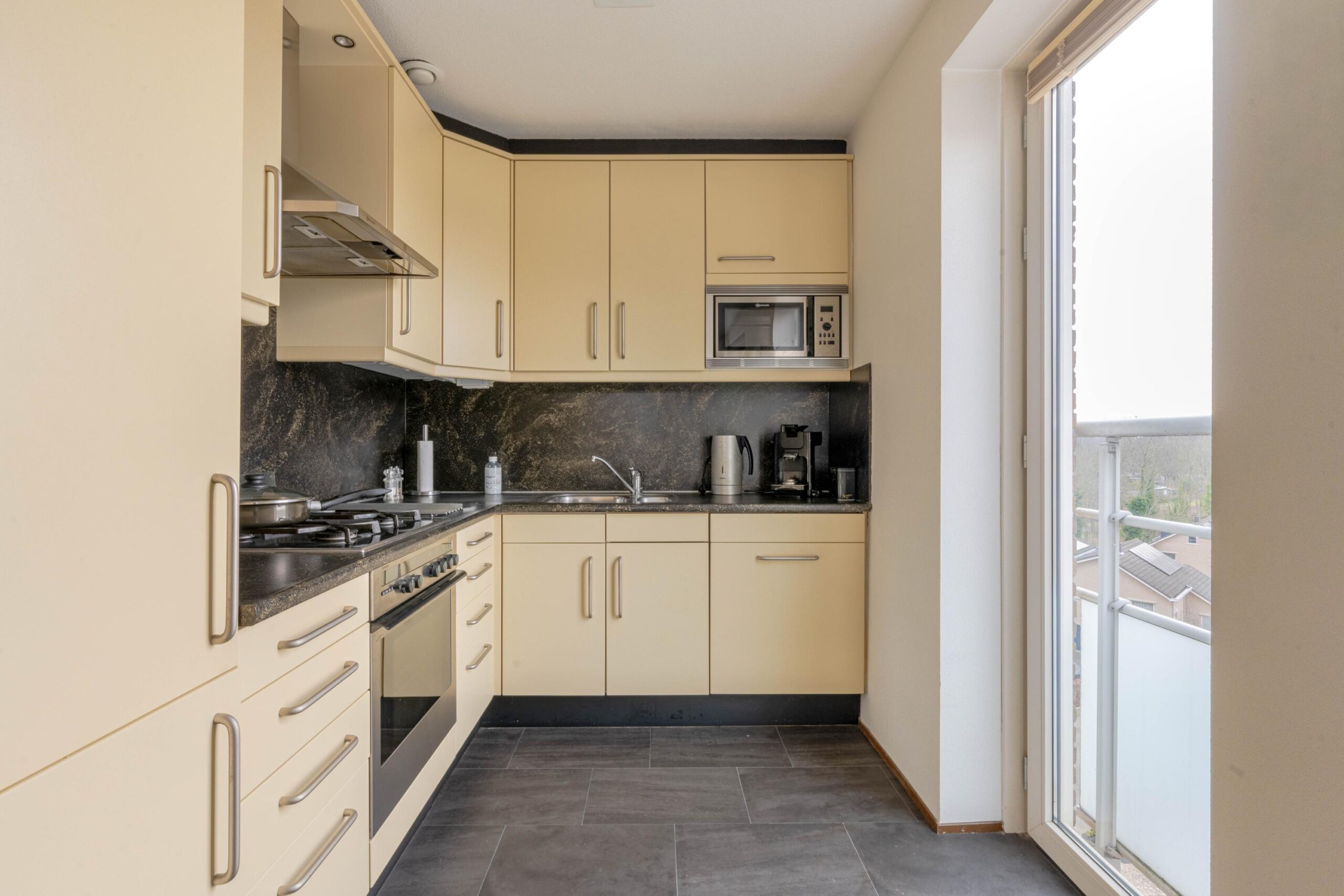 * Open keuken voorzien van tegelvloer, hoekinbouwkeuken met inbouwapparatuur: gaskookplaat, schouw afzuigkap, oven, vaatwasmachine en koel-vriescombinatie.
