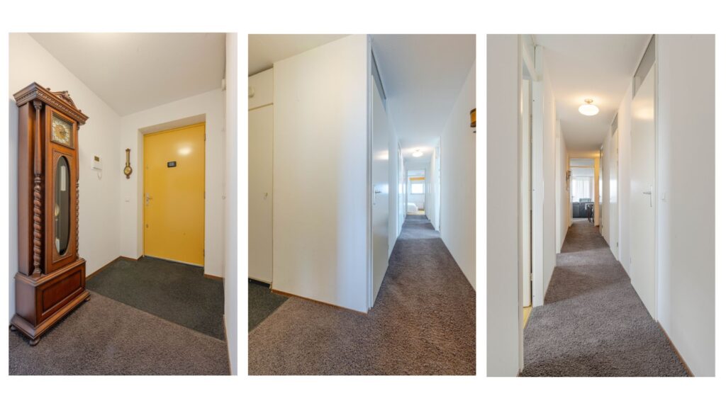 * Woningentree met L-vormige gang voorzien van tapijtvloer, meterkast en toegang tot de verschillende vertrekken.