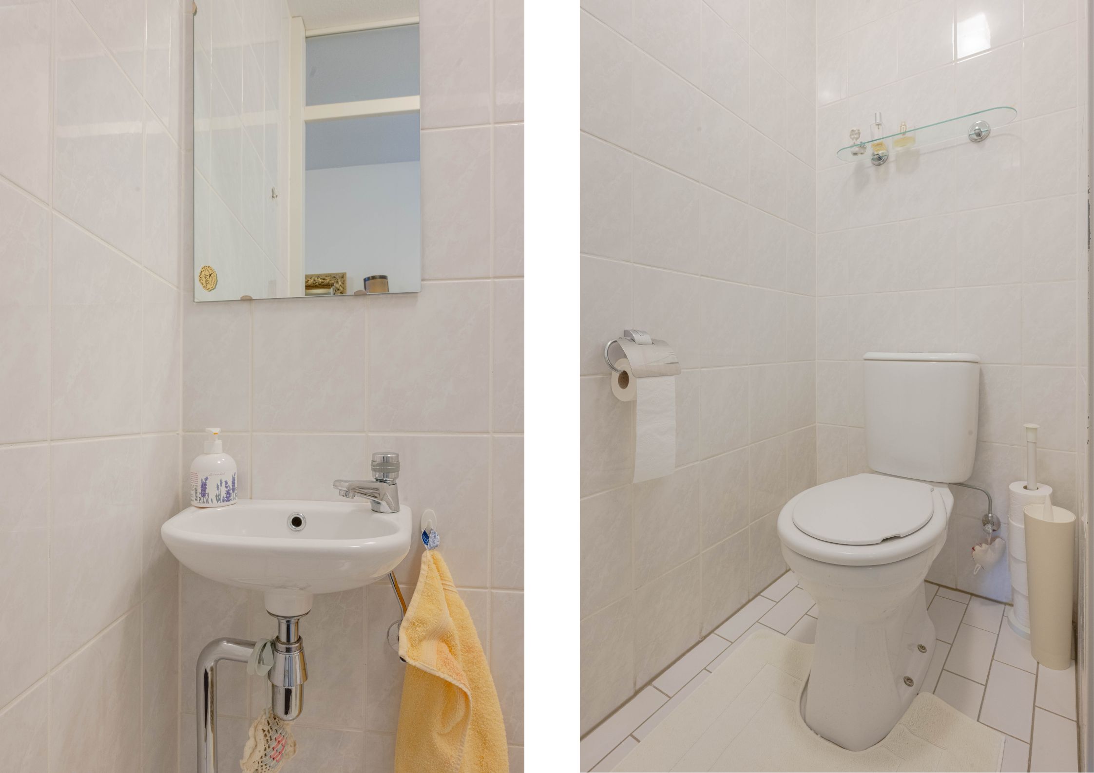 * Toiletruimte met duoblokopstelling, fonteintje en geheel voorzien van betegeling.