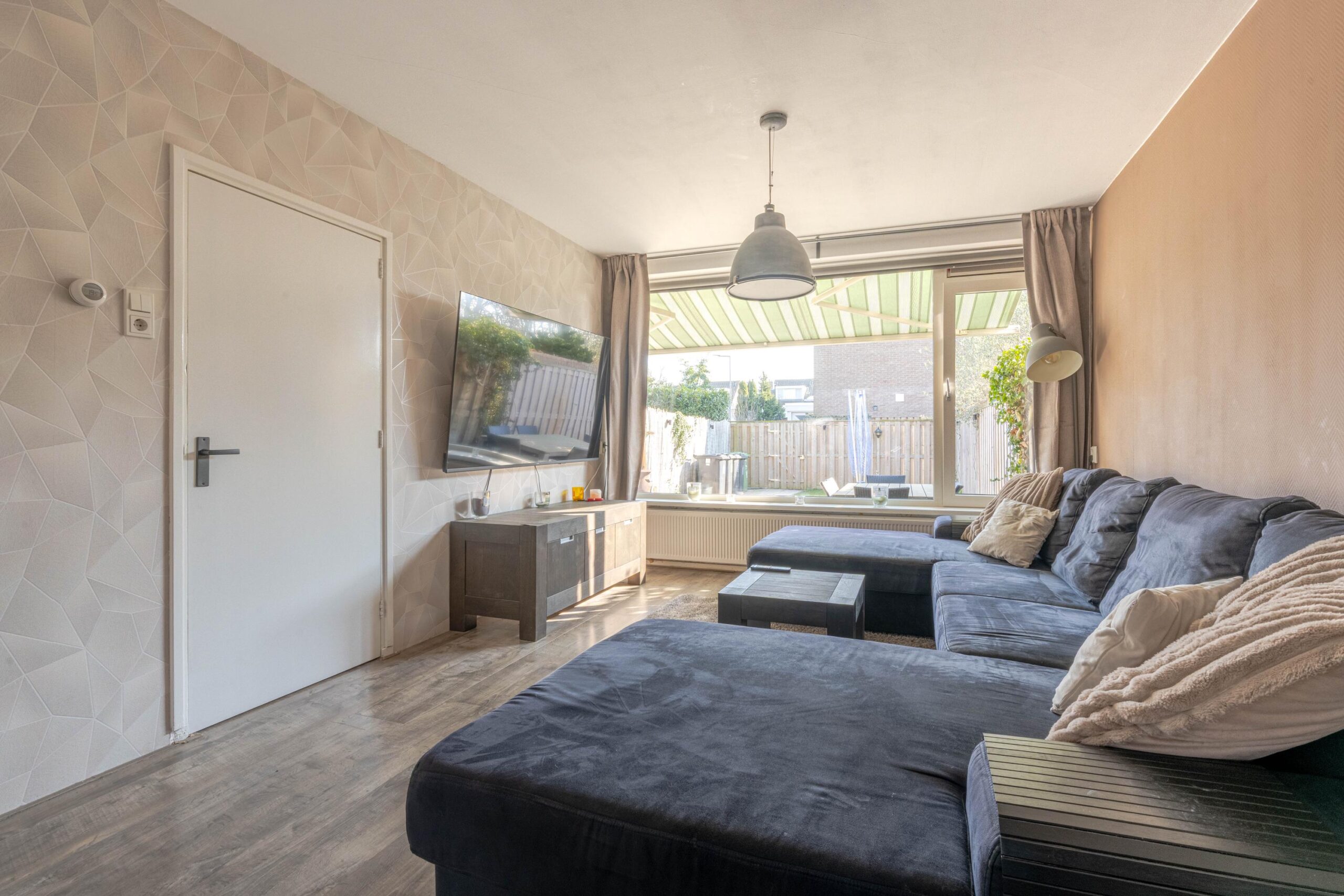 * Doorzon woonkamer voorzien van laminaatvloer, strakke wand- en plafondafwerking en een open verbinding met de keukenruimte.