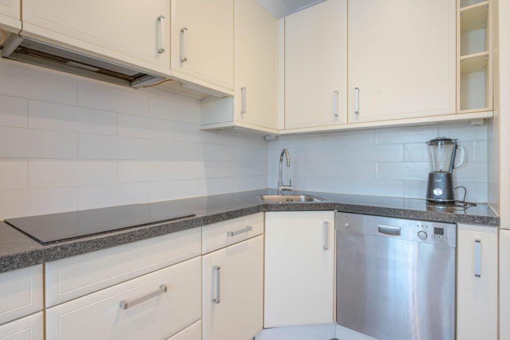* Keukenruimte voorzien van laminaatvloer en een lichte inbouwkeuken in hoekopstelling met inbouwapparatuur: inductiekookplaat, afzuigkap, koel-vriescombinatie, combioven, vaatwasmachine en bergruimte.