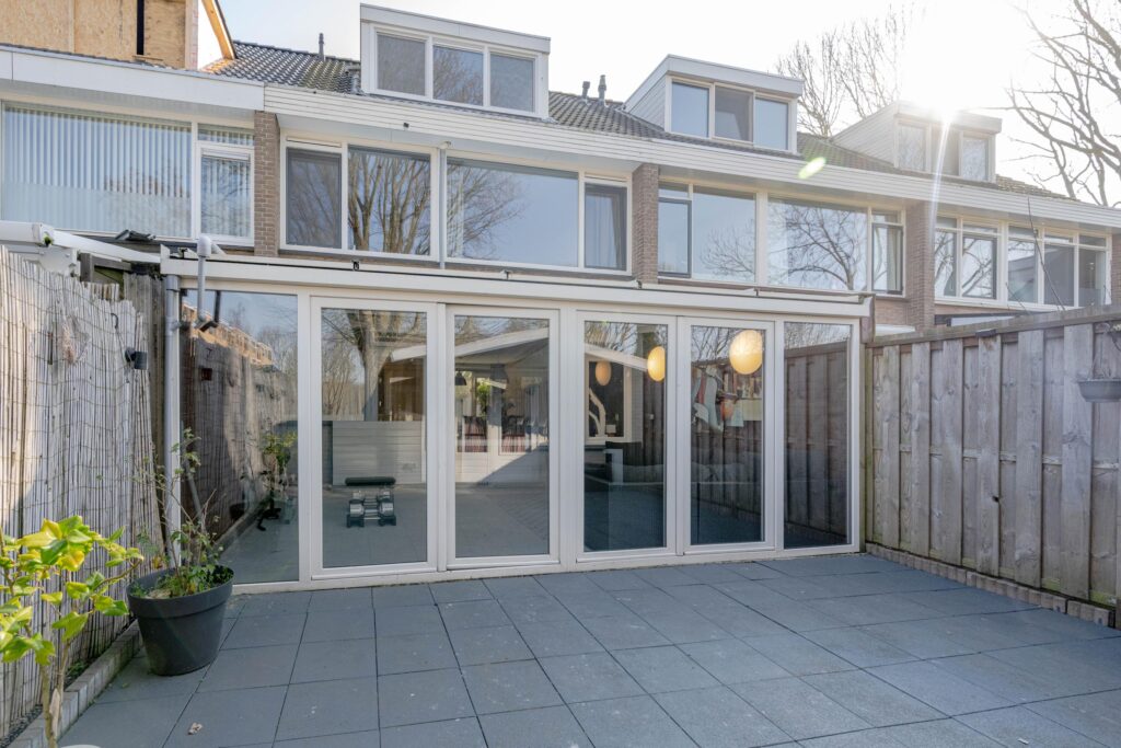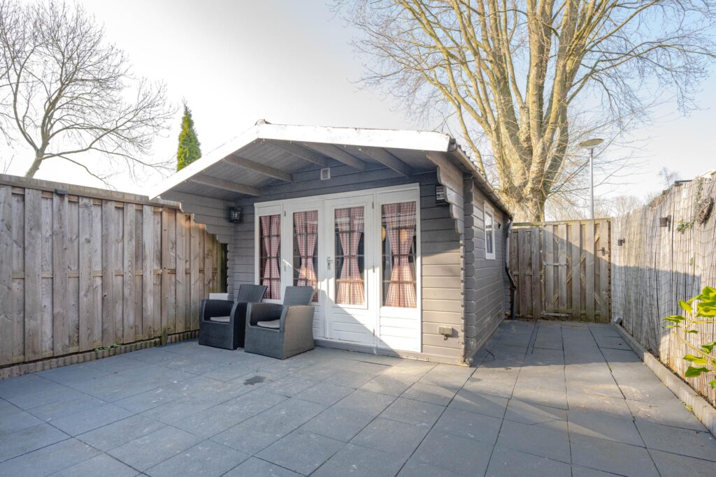 Op de begane grond bevindt zich een sfeervolle doorzonwoonkamer waar veel daglicht en ruimte zorgen voor een open sfeer. De keuken is ruim opgezet en vormt een prettig geheel in combinatie met de woonkamer. Vanuit de woonkamer is er toegang tot de achtertuin waar een aangebouwde serre is gerealiseerd. Deze serre fungeert als een verlengstuk van de woonkamer in de zomermaanden en zorgt voor extra leefruimte. Zowel de voor- als achtertuin zijn verzorgd aangelegd en liggen op het zuiden en westen, waardoor er gedurende de dag altijd een zonnig plekje te vinden is. Daarnaast staat in de achtertuin een ruime houten schuur van circa 13 m², ideaal voor extra opslag.