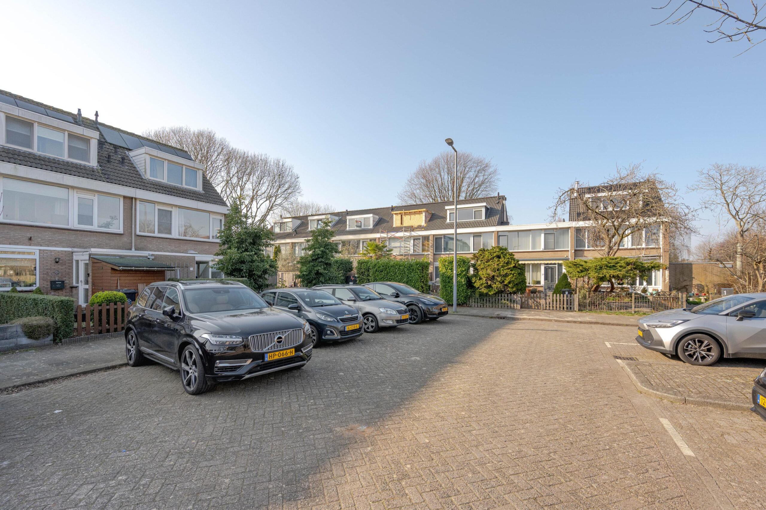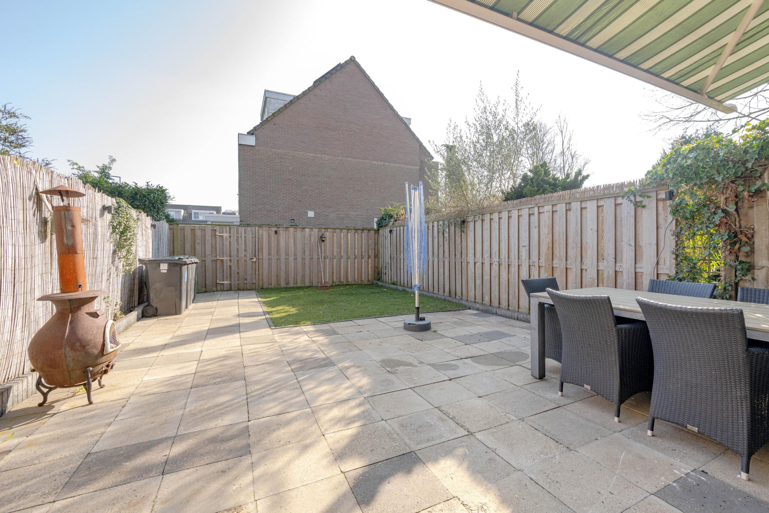 * Voortuin voorzien van bestrating, gazon, omheining middels houten schuttingen en elektrische zonwering.