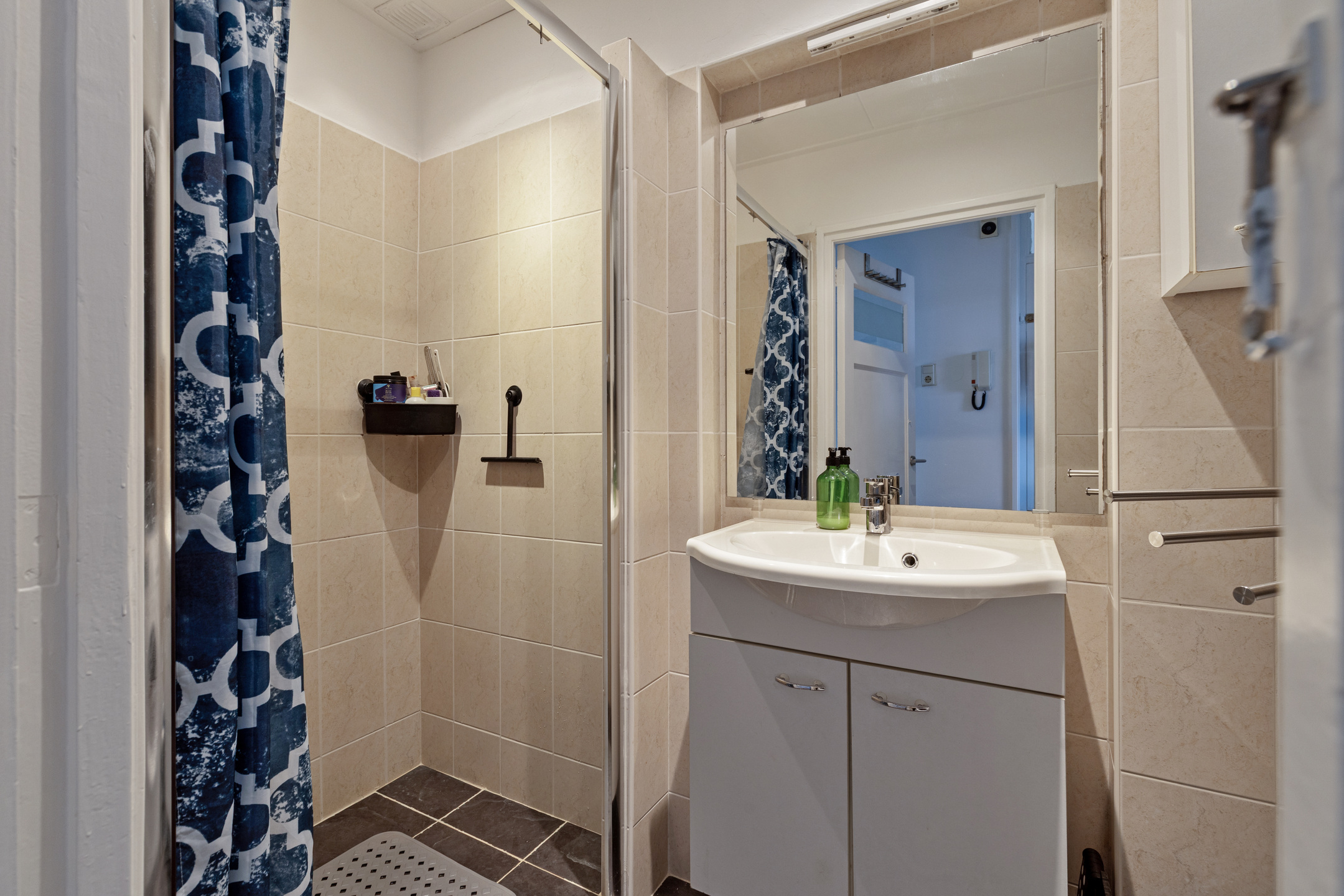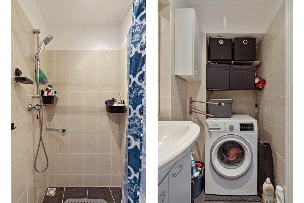 * Badkamer voorzien van betegeling, inloopdouche met douchegordijn, wastafelmeubel en wasmachine-aansluiting.