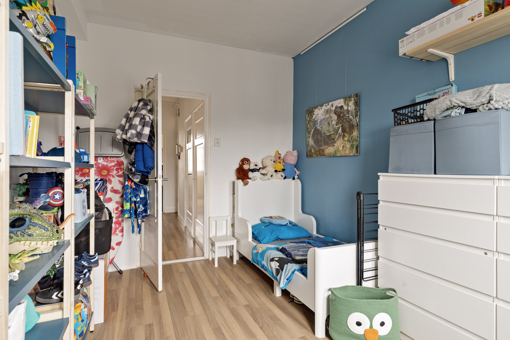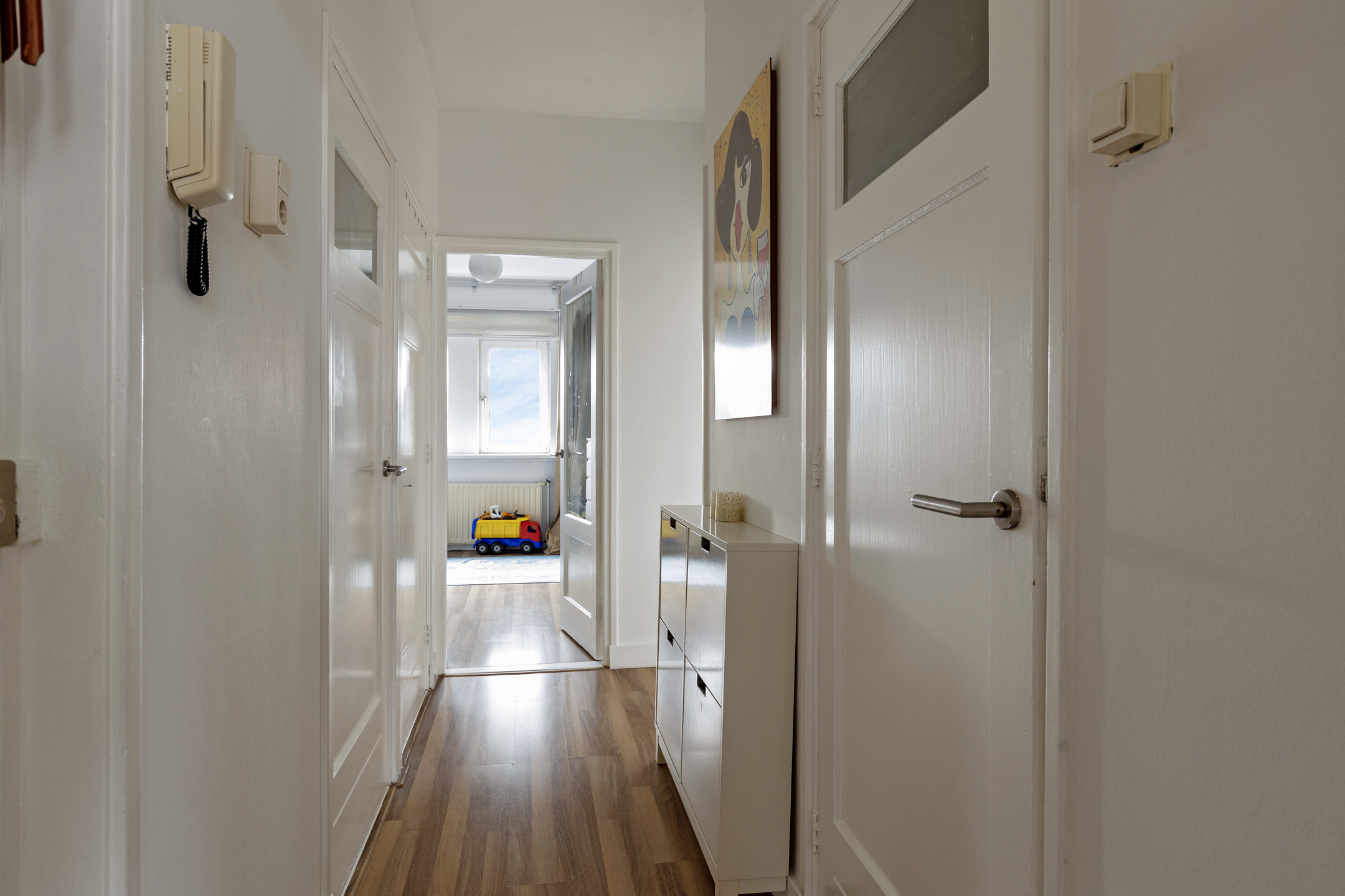 * Woningentree met de meterkast in het portiek naast de voordeur; hal voorzien van laminaatvloer, vaste kast met de opstelling van de combiketel en wasmachine-aansluiting.