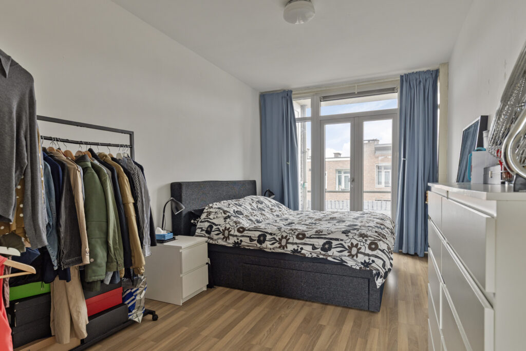 * Slaapkamer I aan de achterzijde voorzien van laminaatvloer, gestucte wanden en plafond en openslaande deuren naar het inpandig balkon.