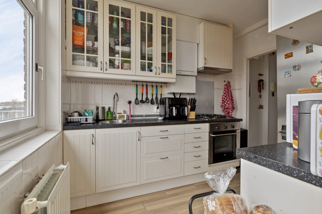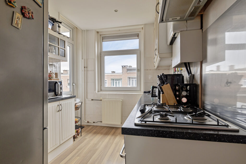 * Keuken aan de voorzijde met een inbouwkeuken aan beide zijden met diverse apparatuur: gaskookplaat, afzuigkap, oven en losse koel-vriescombinatie; opstelling van de C.V.-combiketel en een deur naar het balkon.