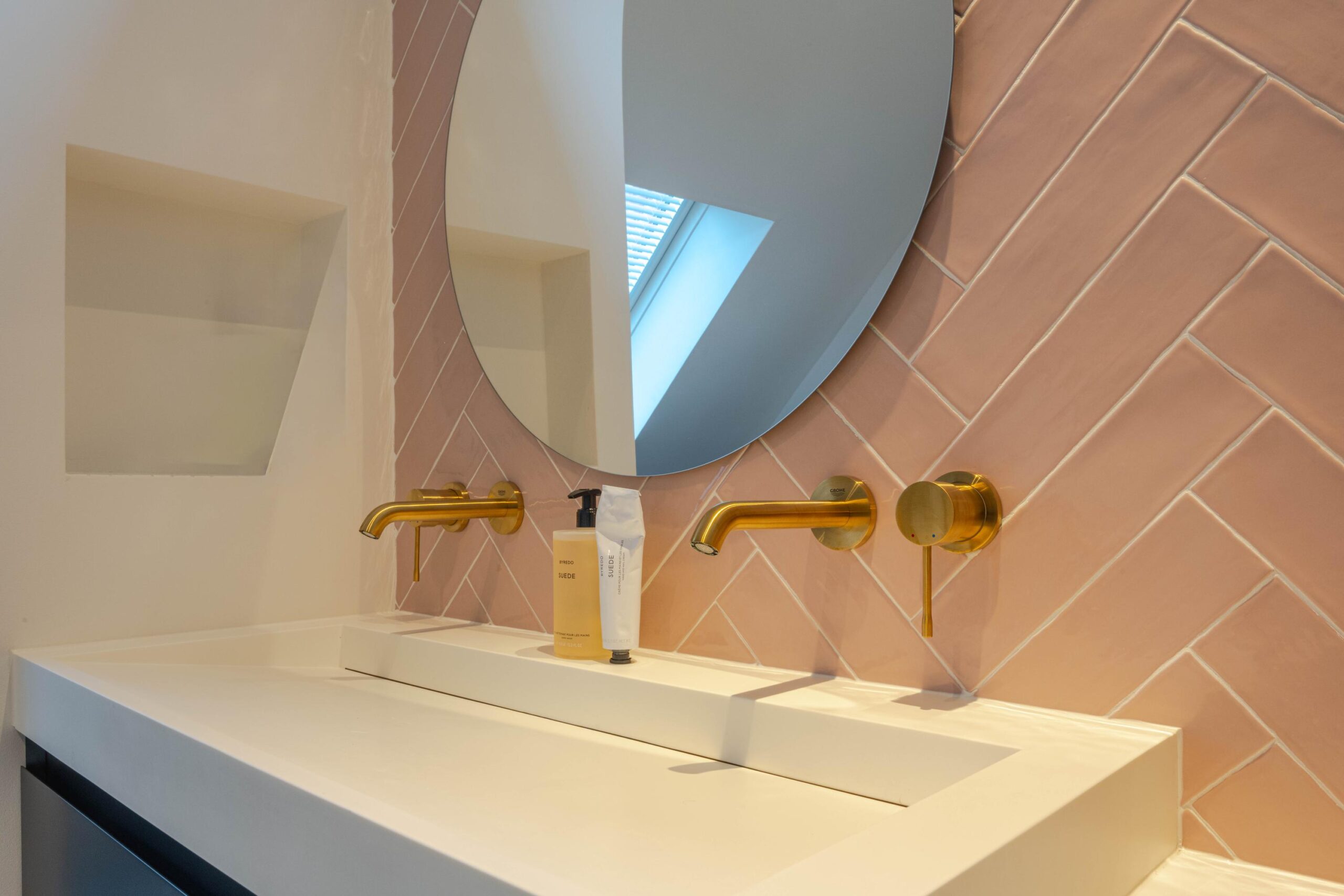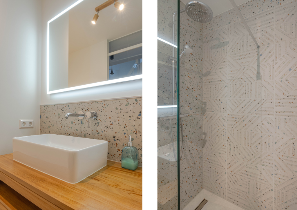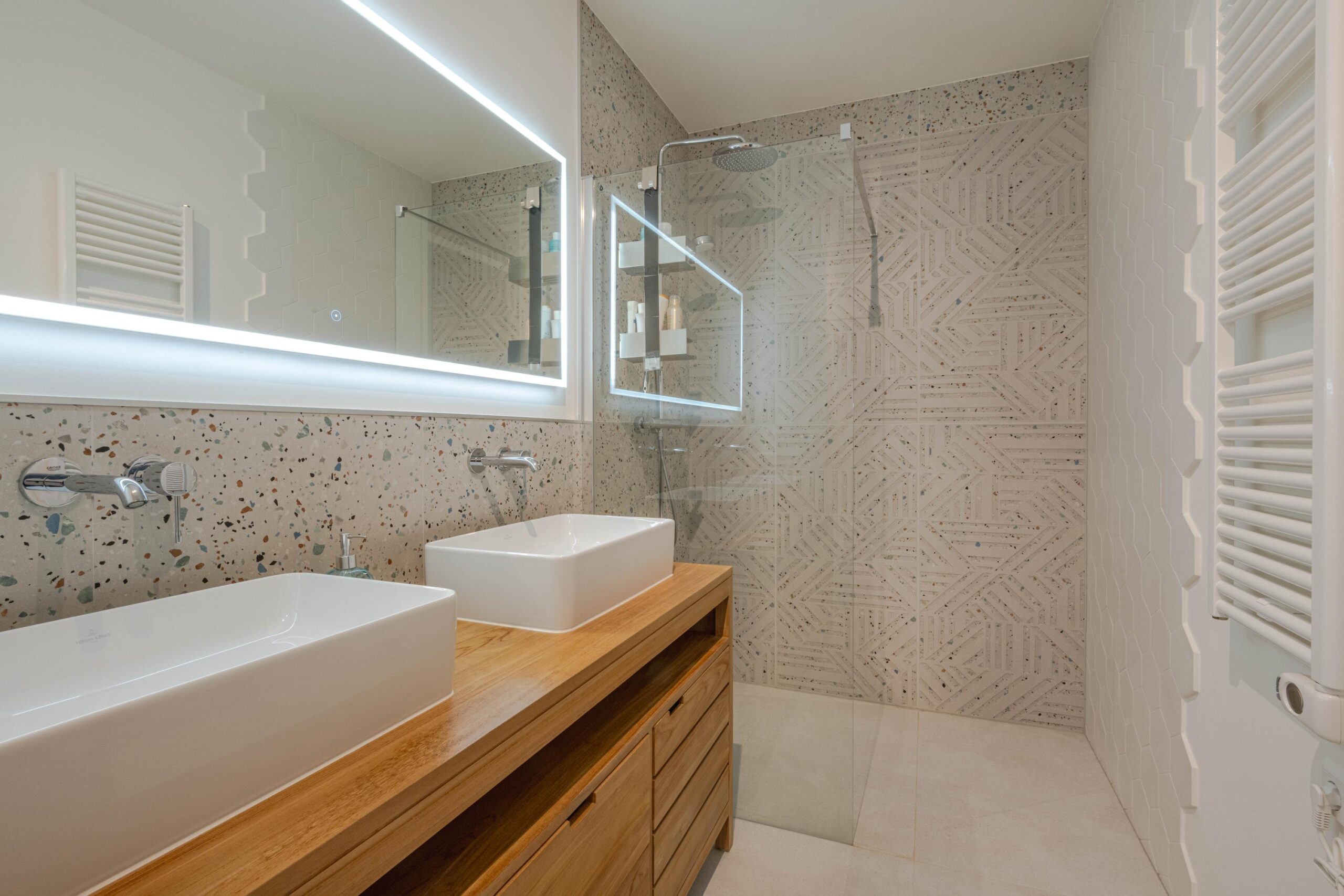 * Moderne badkamer I deels voorzien van betegeling, inloopdouche met regendouche-opstelling, wastafelmeubel met twee waskommen en een spiegel met Ledverlichting, 2e toilet en designradiator (elektrisch).