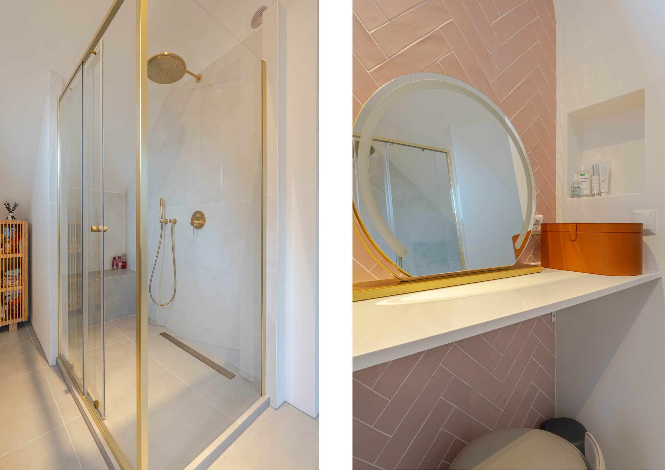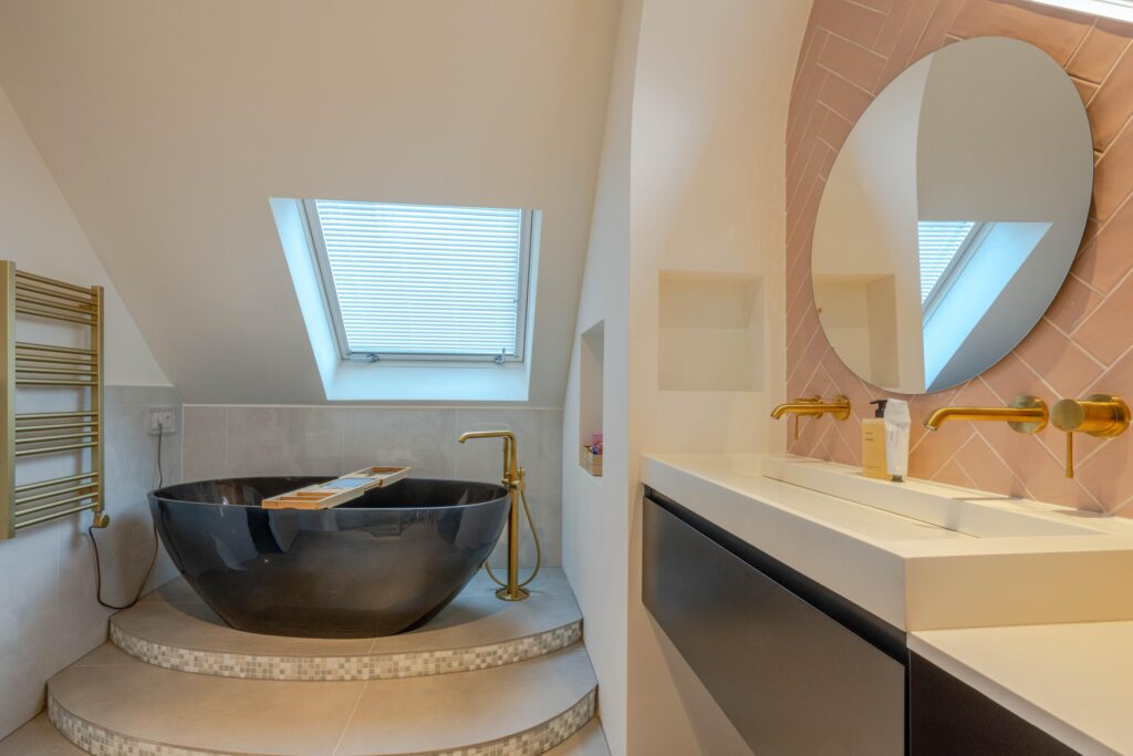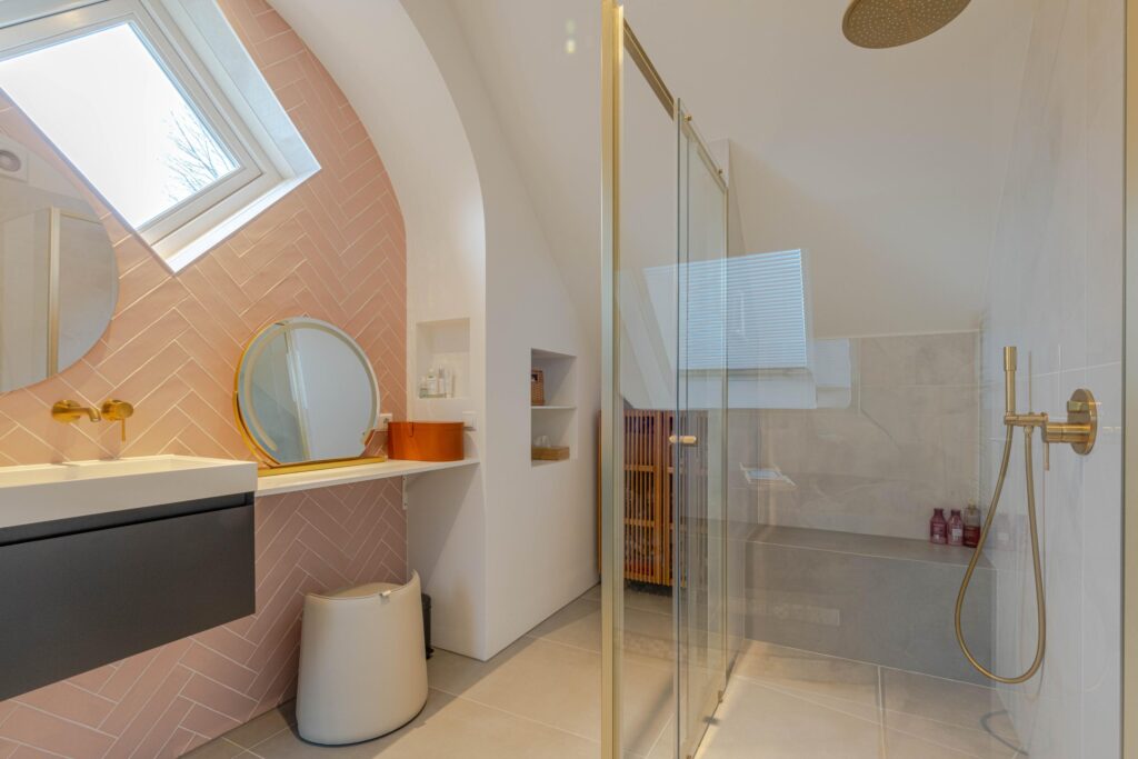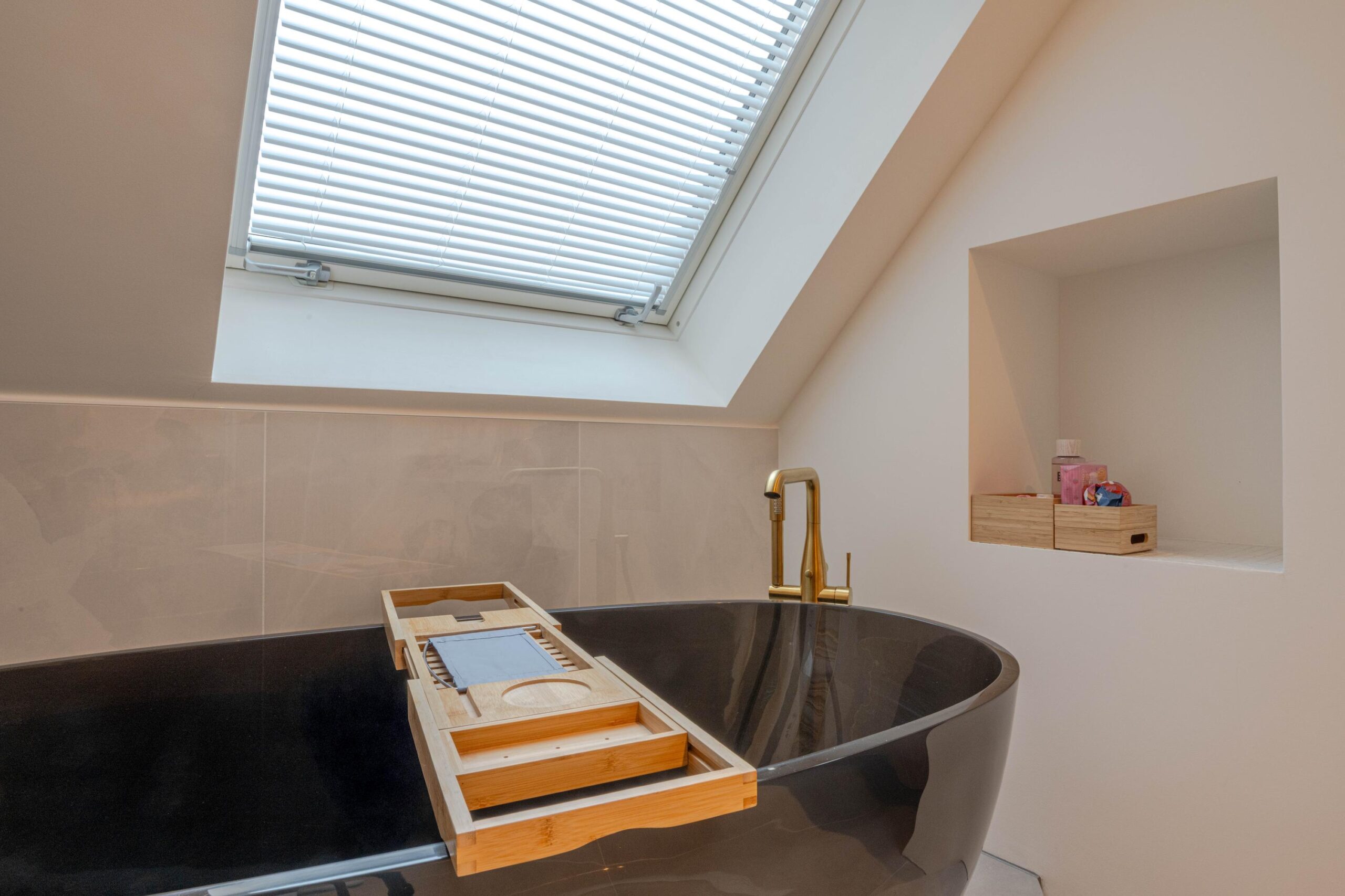 * Ruime luxe design badkamer II met natuurlijk licht door een raam en dakraam, deels voorzien van betegeling, ruime douchecabine met regendouche-opstelling en zitje, wastafelmeubel met twee kranen, losstaand bad met losse kraanopstelling en designradiator (elektrisch).