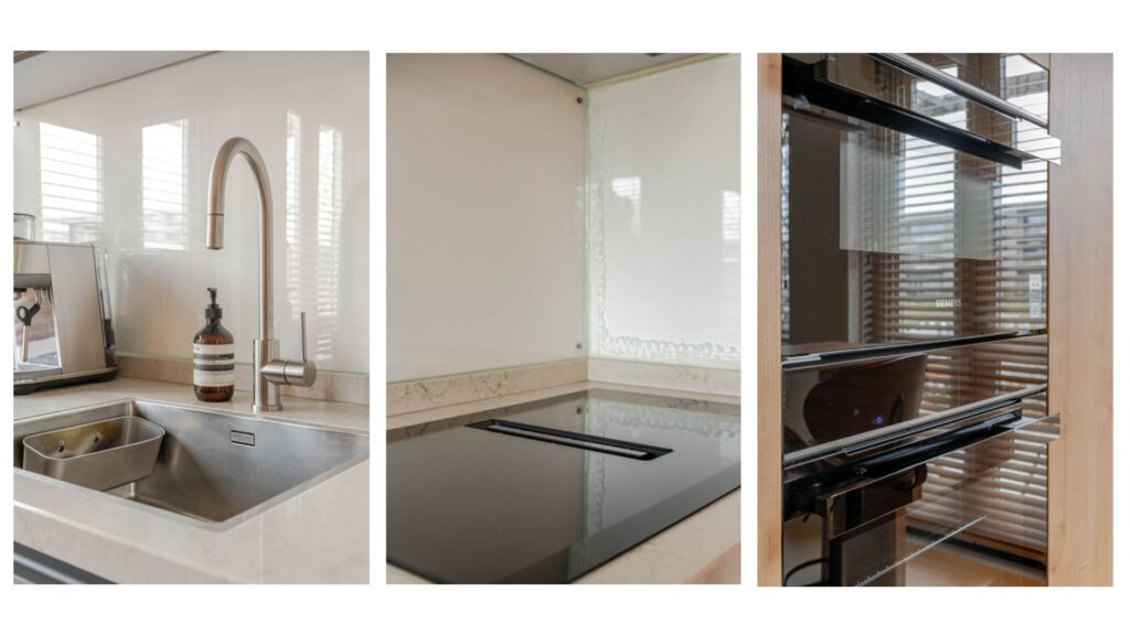 * Open keukenruimte voorzien van luxueuze inbouwkeuken met in het centrum een bar, aan de linkerzijde kastruimte met een koelkast met vriesvak, combimagnetron en een oven. Aan de rechterzijde de opstelling met kastruimte. lades en het werkblad met inbouwapparatuur: inductie kookplaat met ingebouwd afzuigsysteem, spoelbak en vaatwasmachine.
