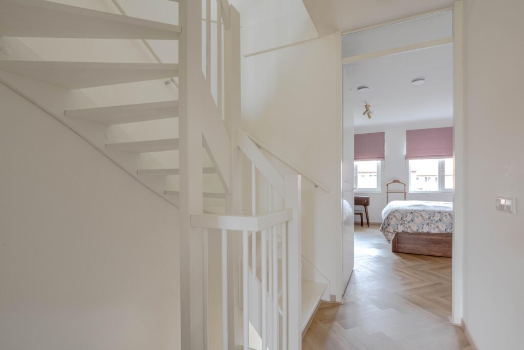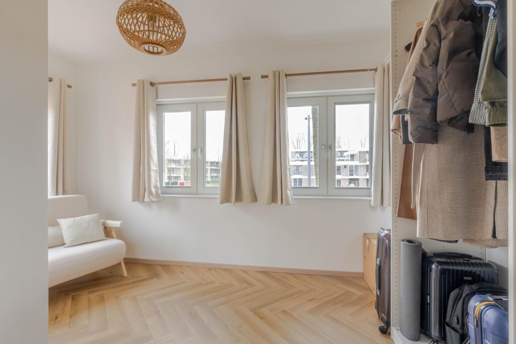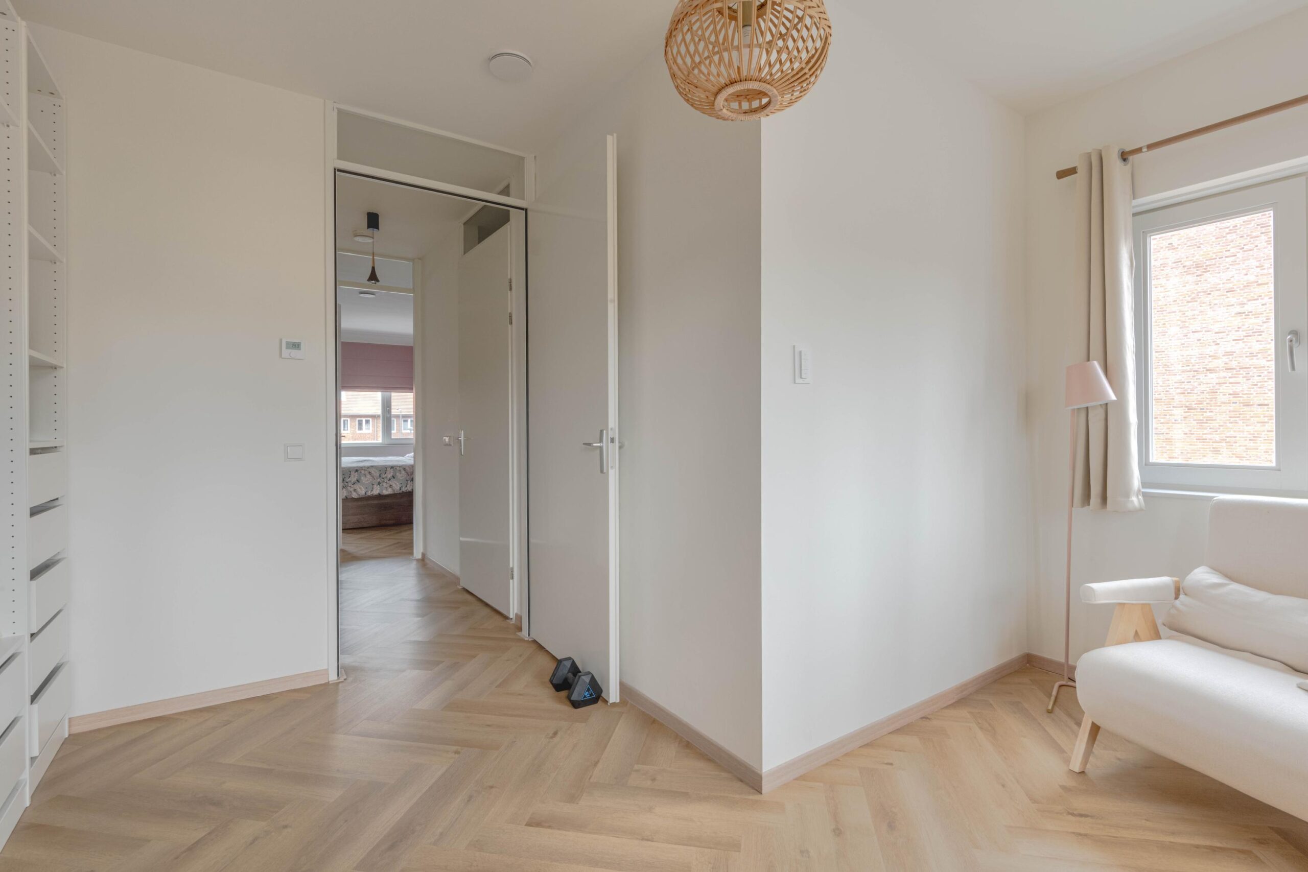* Slaapkamer I aan de voorzijde, voorzien van vissengraat laminaatvloer en strakke wanden en plafond.