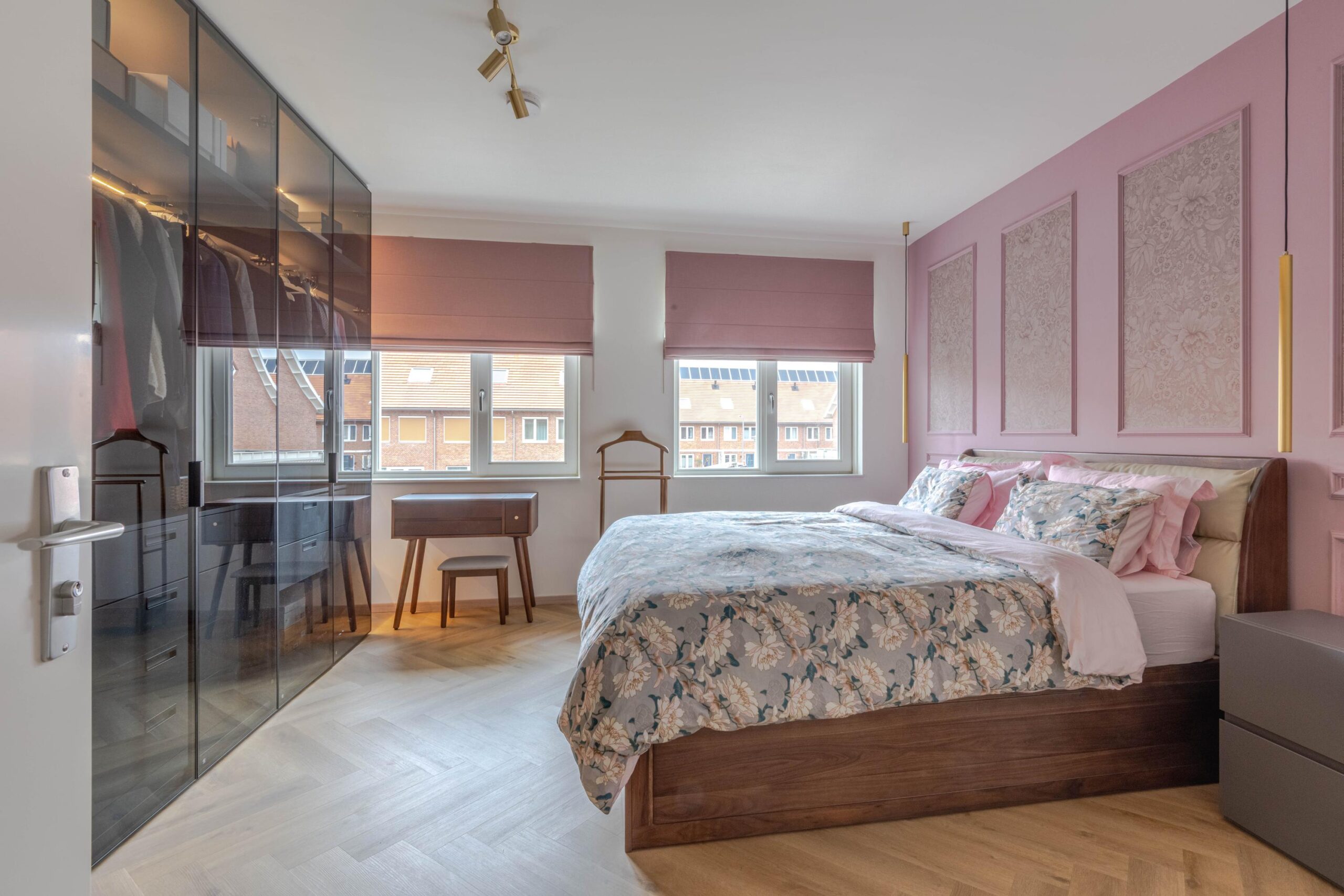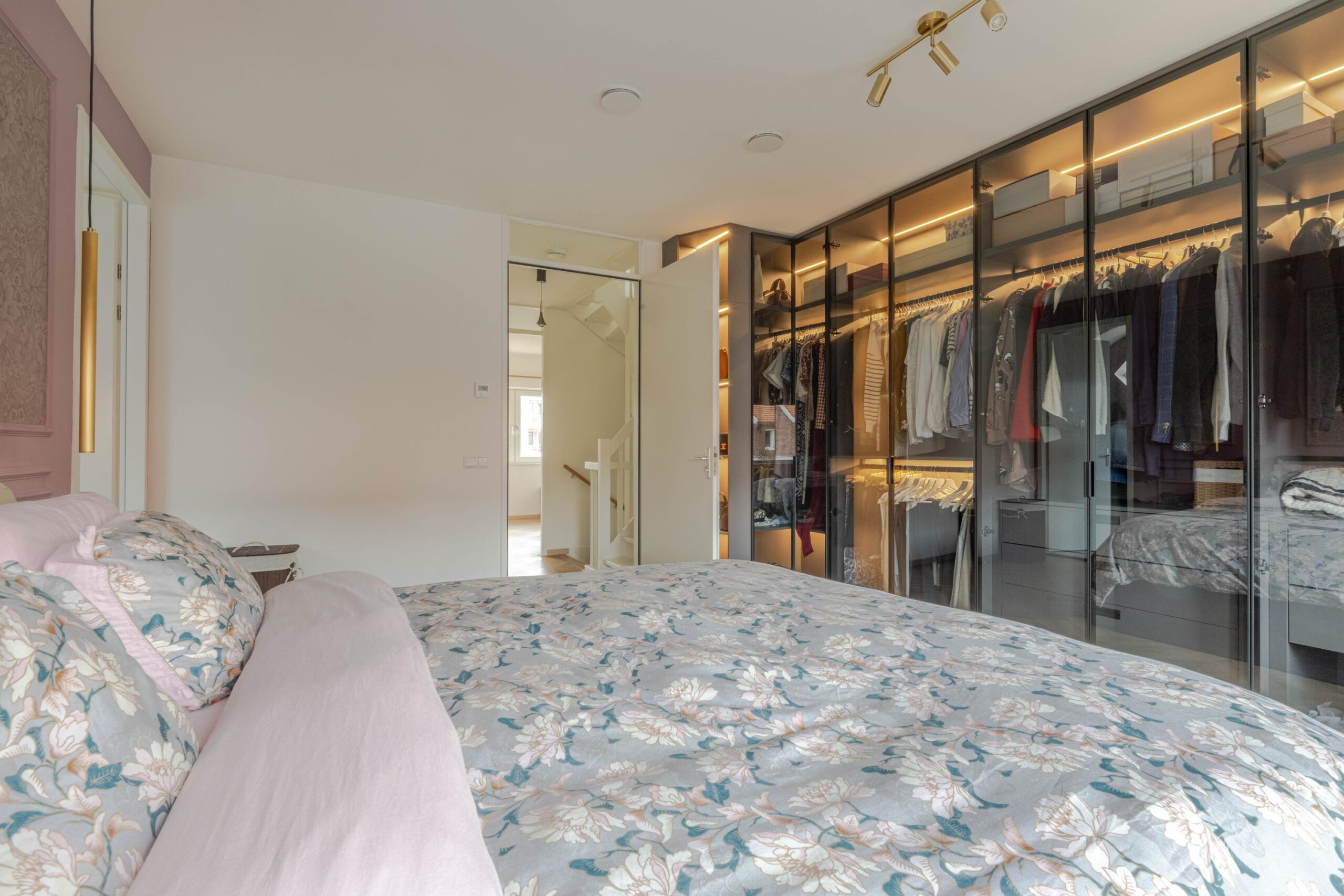 * Slaapkamer II aan de achterzijde, voorzien van vissengraat laminaatvloer, strakke wanden en plafond en een grote kastenwand met glazen deuren en verlichting.