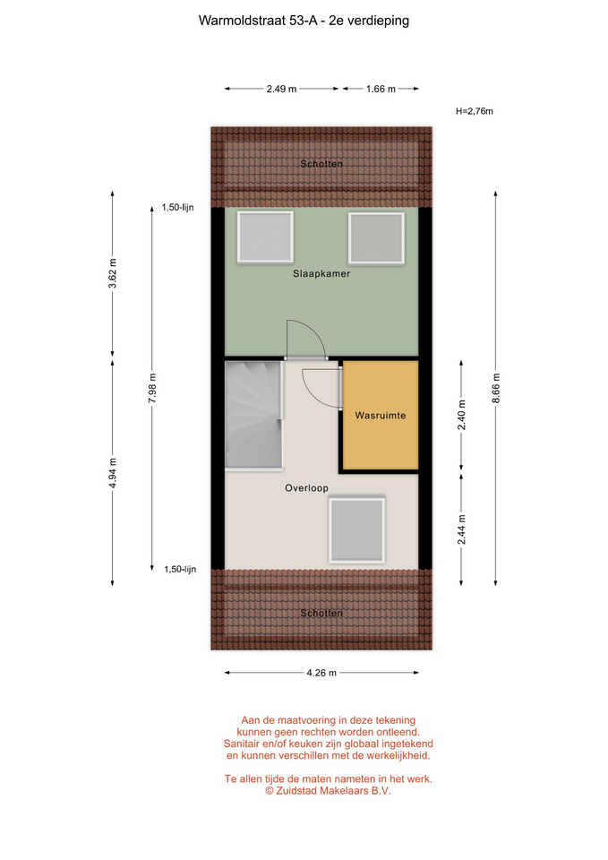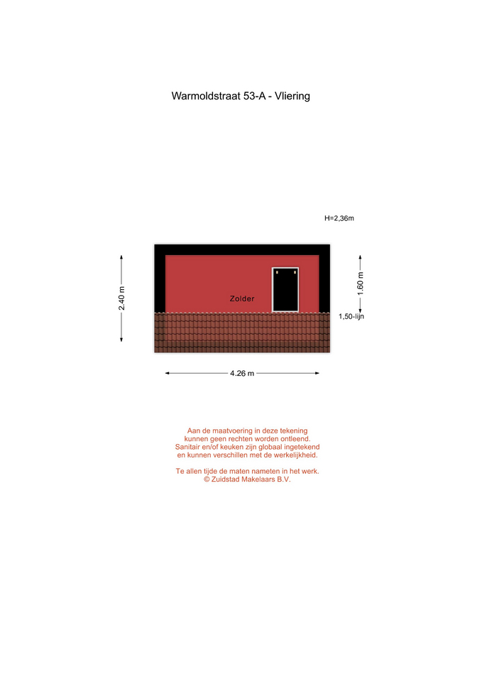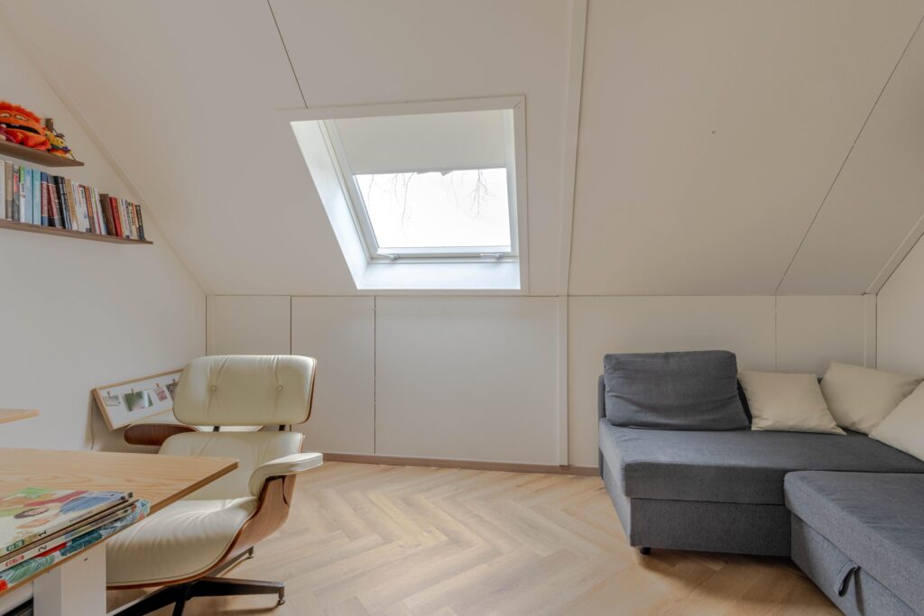 * Voorzolder, voorzien van vissengraat laminaatvloer, dakraam, bergruimte achter knieschotten en toegang tot de verschillende vertrekken.