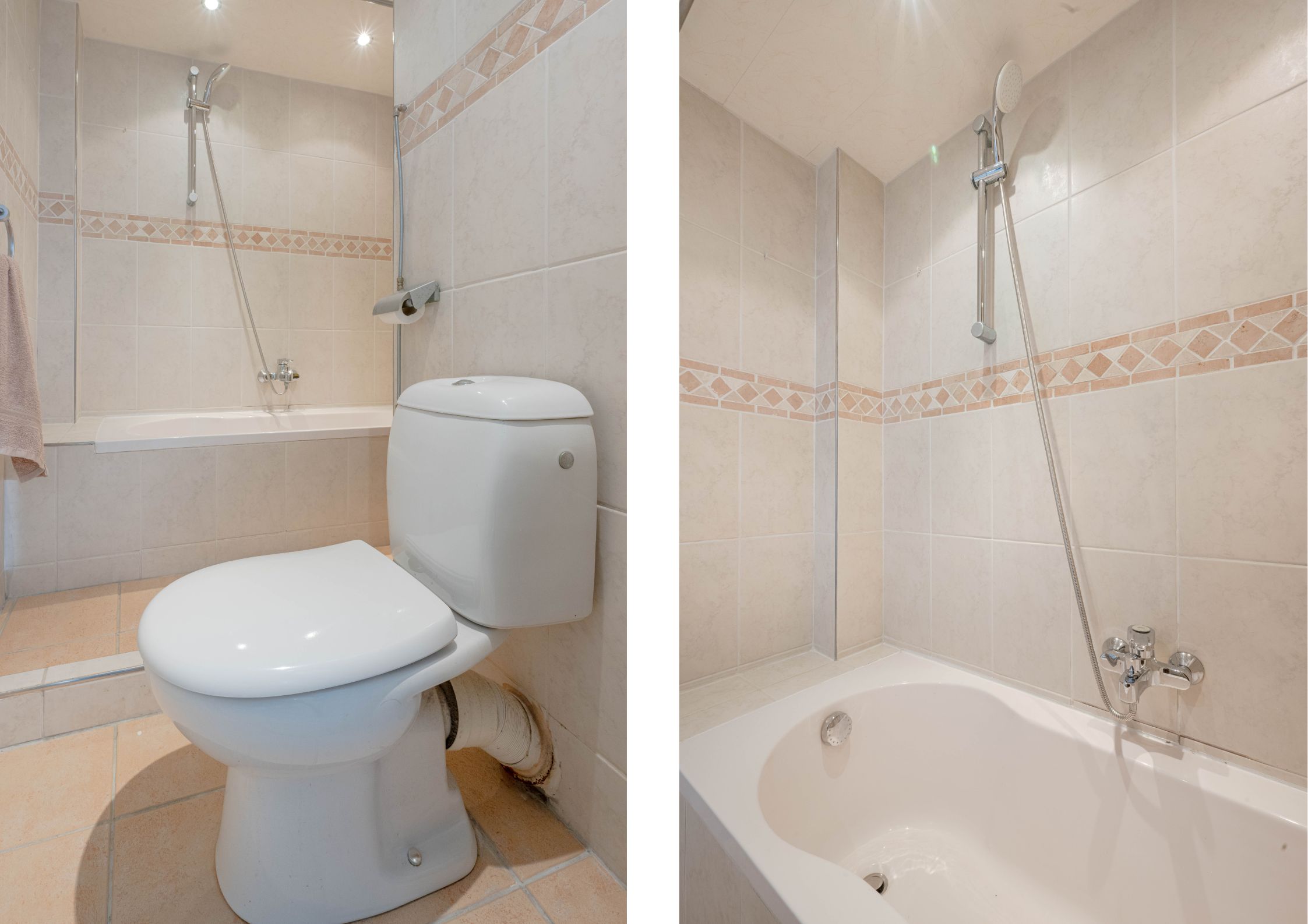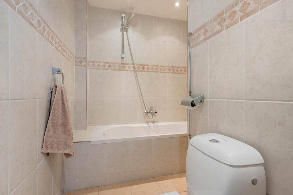 * Badkamer, geheel voorzien van betegeling, ligbad met douche-opstelling en duoblok-toiletopstelling.