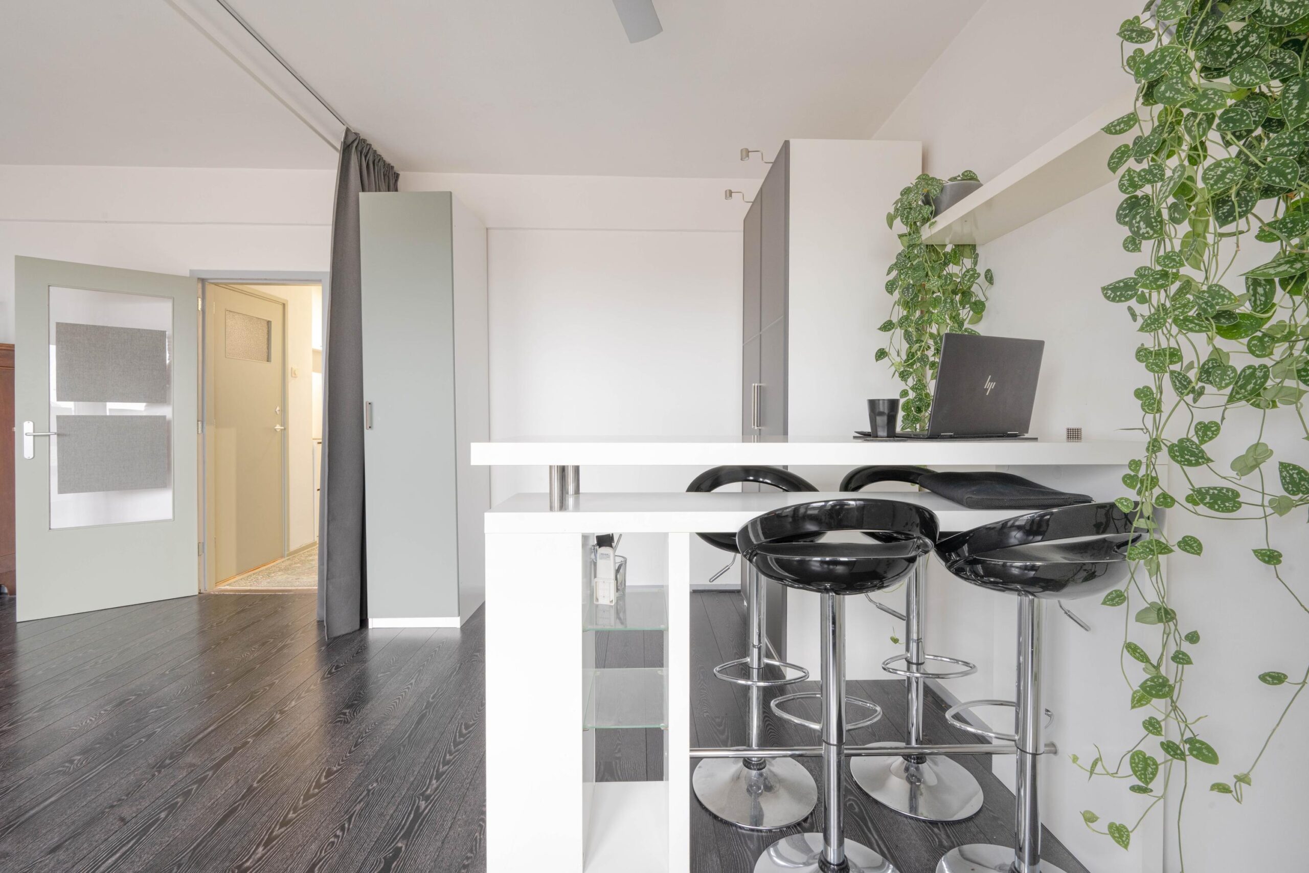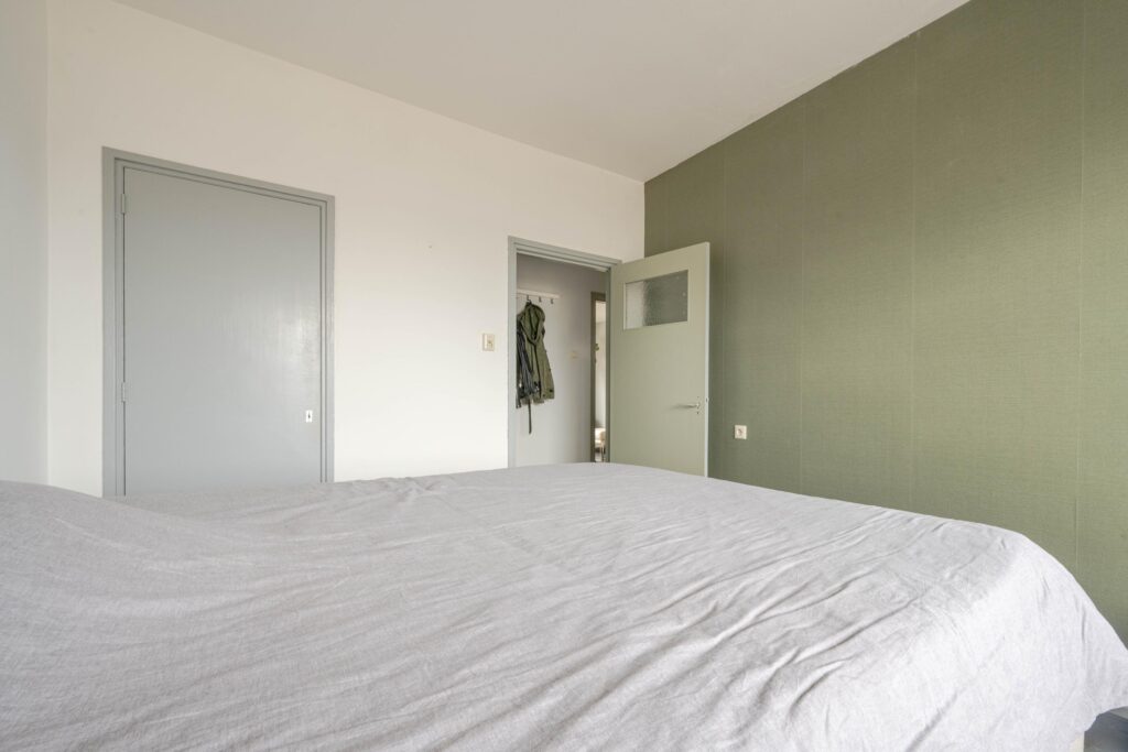 * Slaapkamer aan de galerijzijde voorzien van laminaatvloer, strakke wanden en plafond en een vaste kast.