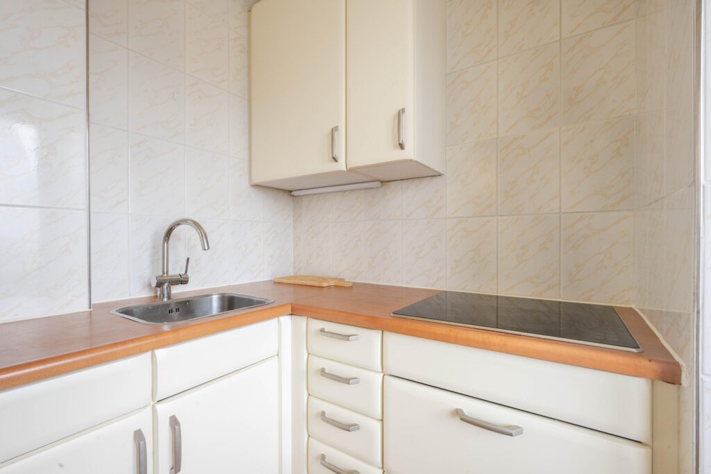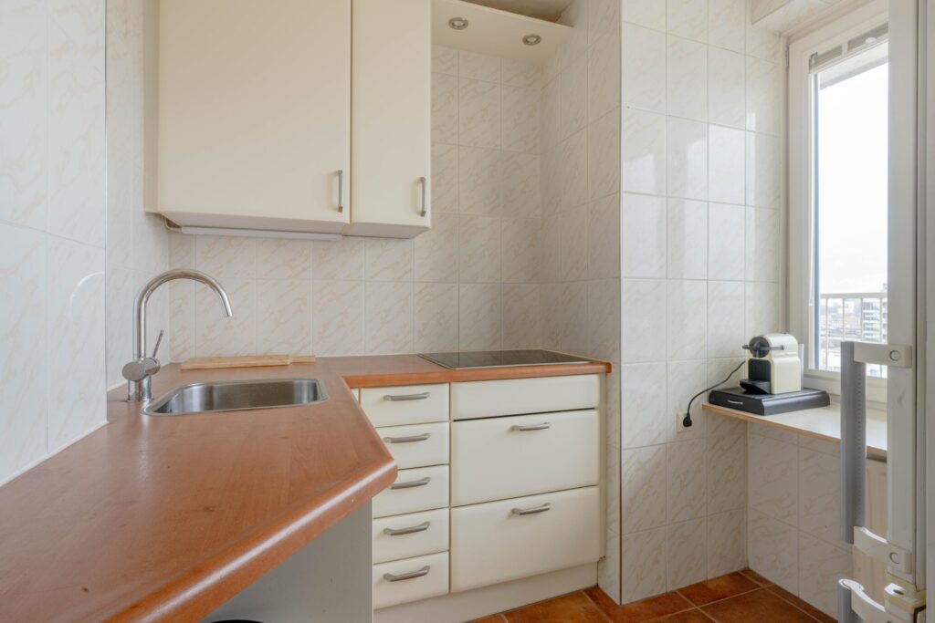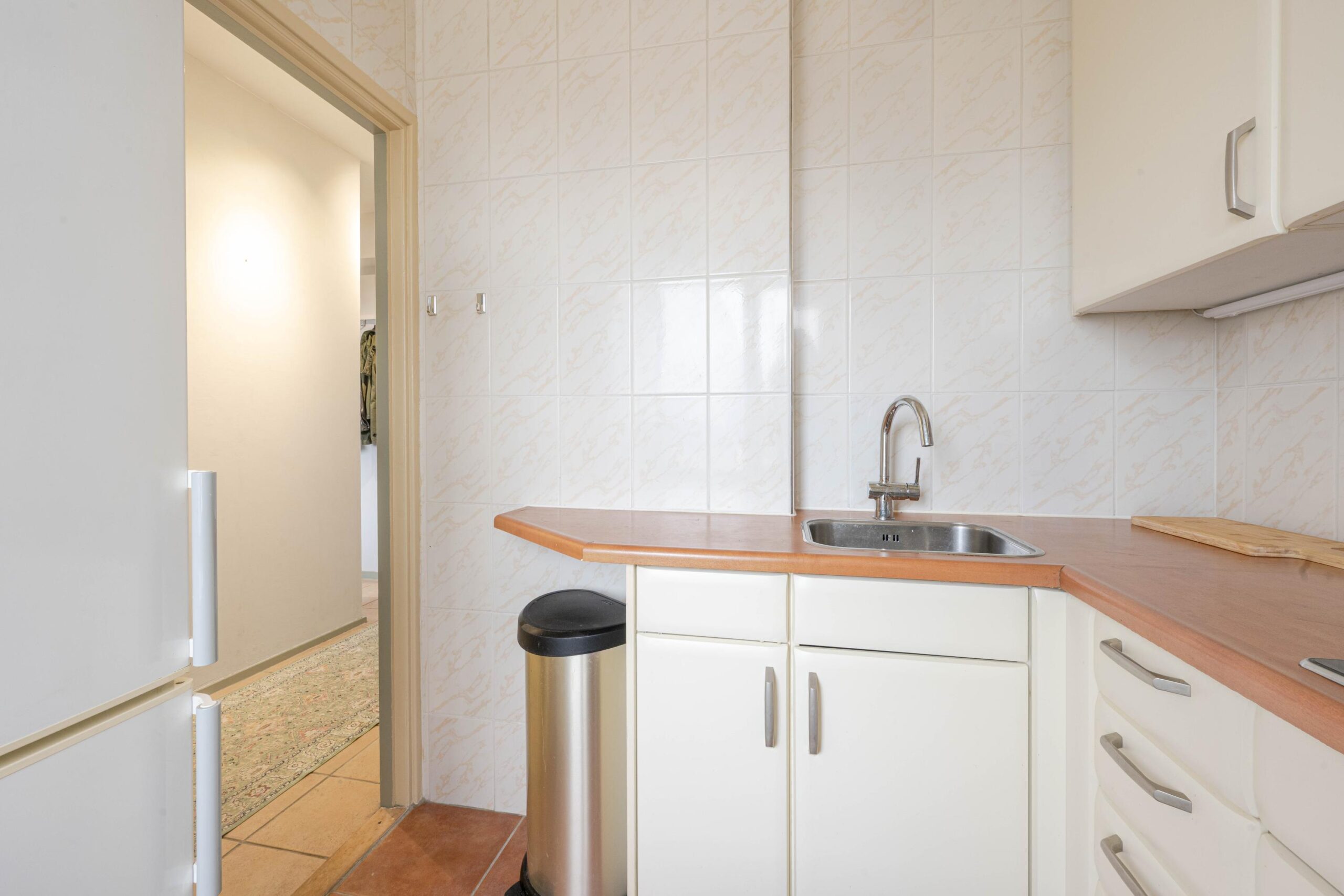 * Keukenruimte met tegelvloer, voorzien van hoekinbouwkeuken met een inductiekookplaat, opslagruimte, spoelbak en losse koel-vriescombinatie,