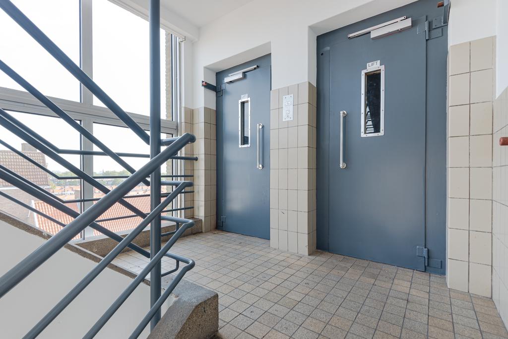 * Entree via de centrale ontvangstruimte met postbussen, intercom en bellentableau, lift die stopt halverwege de etages.